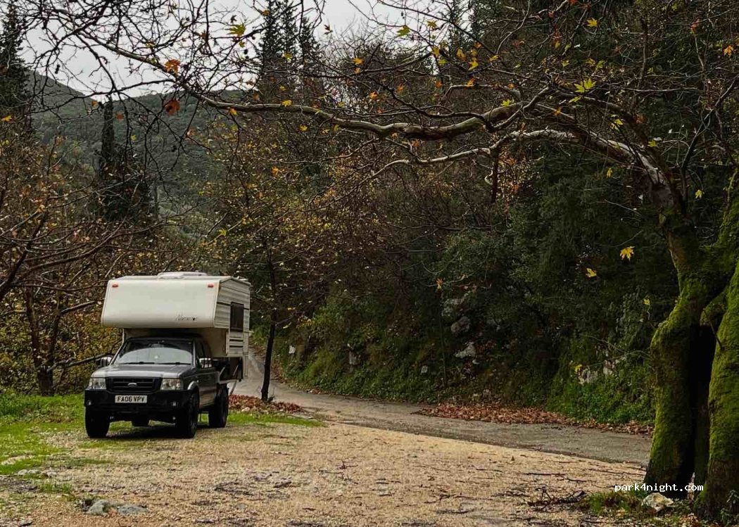 Nice park up. We stayed the night in our 7.6mtr motorhome. Lovely and quiet and one other van stayed too. No problems getting there other than the link on Google maps took us to the wrong place for some reason. Waze got us here no problem though so just double check when picking your guidance. The taverna’s great with lovely staff and the waterfalls are lovely. Take some swim shorts and a towel.