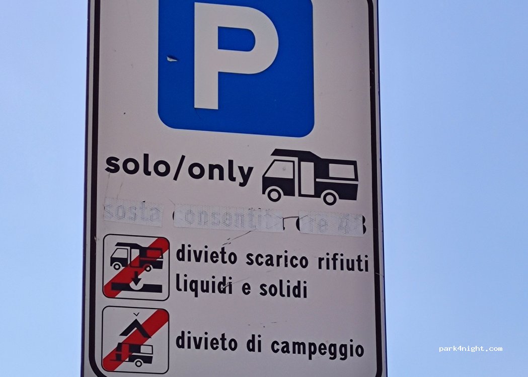 Level asphalt parking dedicated to campers in front of the Eurospin supermarket. Possible to stay overnight but adjacent to a very busy state road. Distance from the sea about 500 meters.