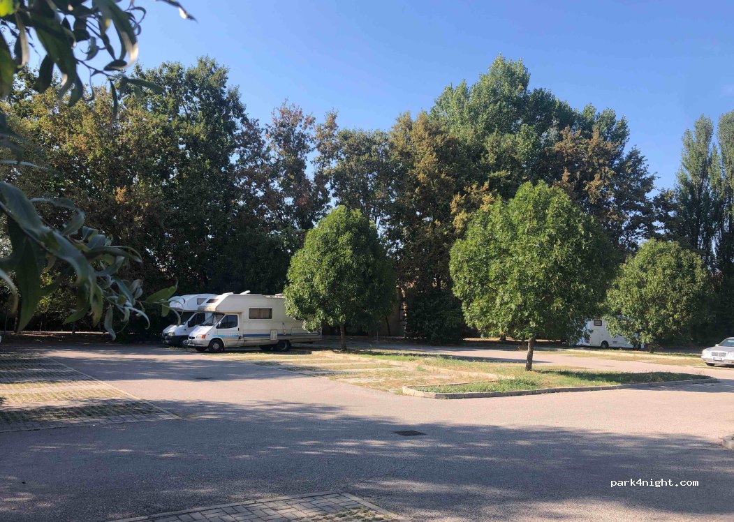 Large shaded car park, easy to access (large motorhome also) ideal for a lunch break. Possible to spend a night I think. A water point further on the footpath.