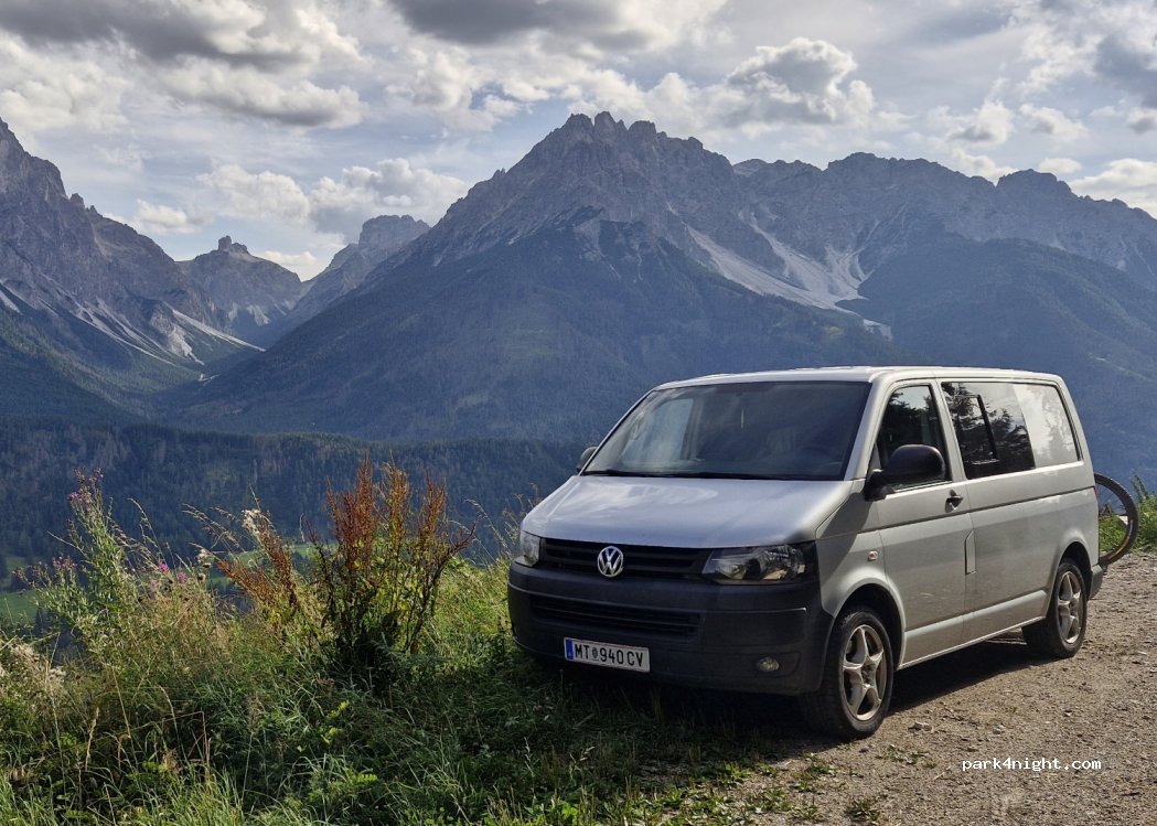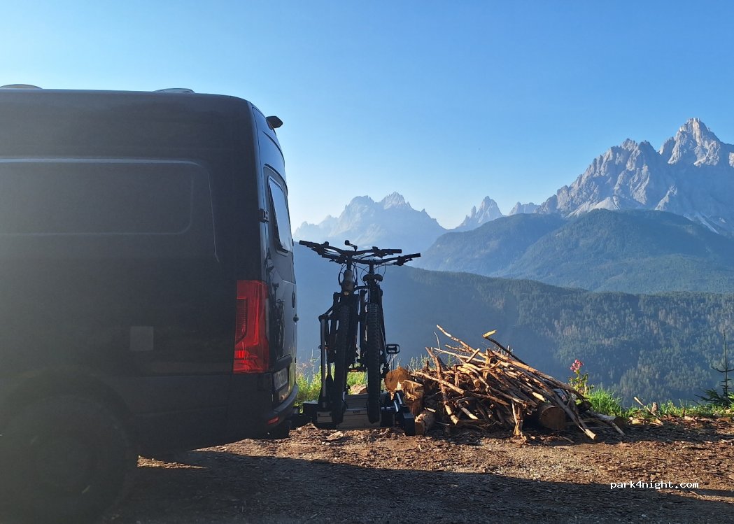 Sieht eher aus wie eine Ausweichstelle. Außerdem sah es so aus, als ob die Stelle von Murenabgängen betroffen sein könnte. Auch geht es daneben sehr steil runter. Lieber weiter vorne auf dem Weg sind schöne Parkbuchten. Für ein Foto mit Bergen und Camper aber einen Halt wert.