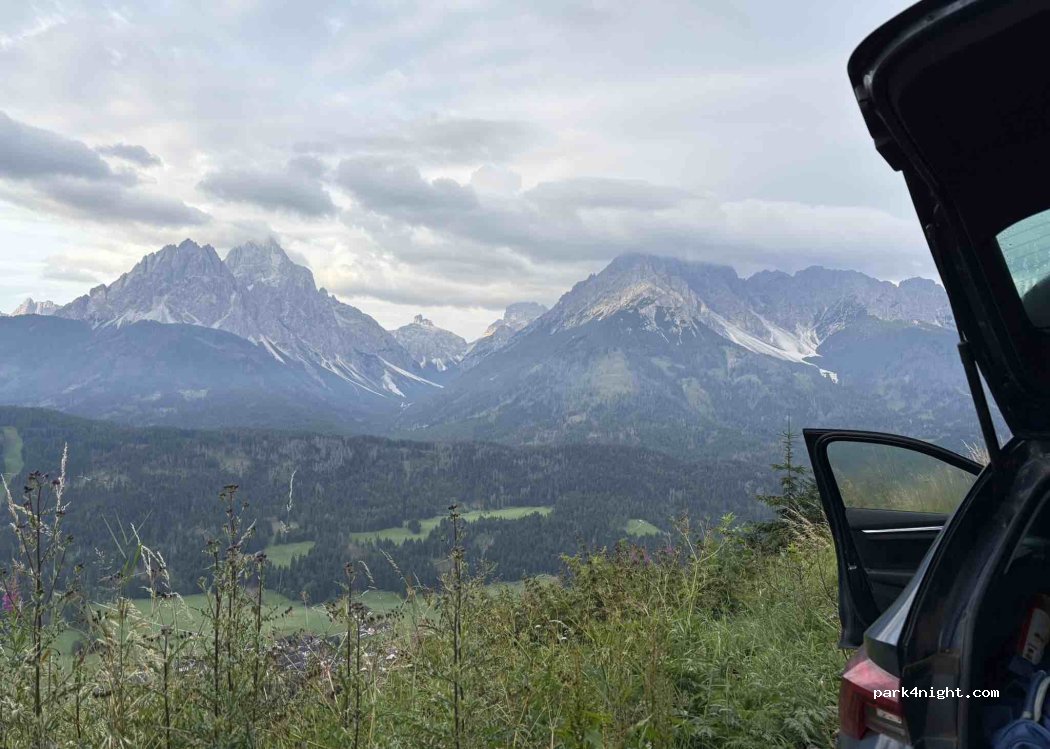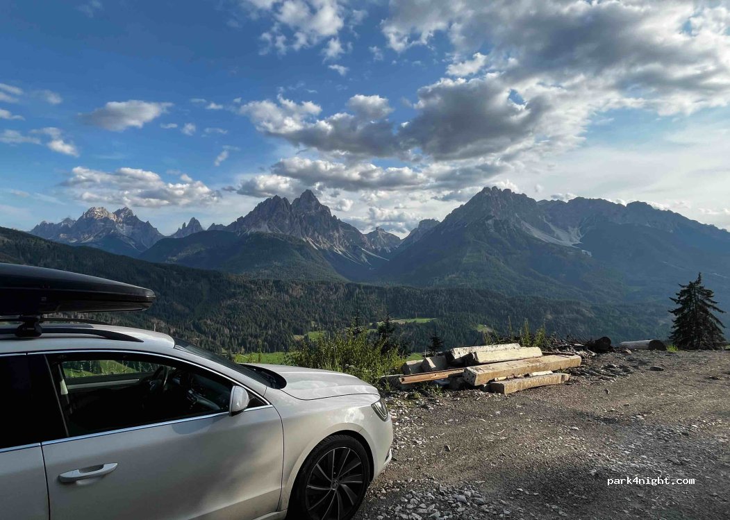 Flat area for one or two cars (or motorhomes), amazing view to the mountains. Roud is nearby but there was just one car passing by .