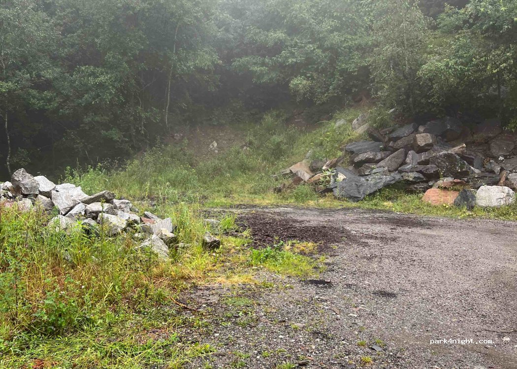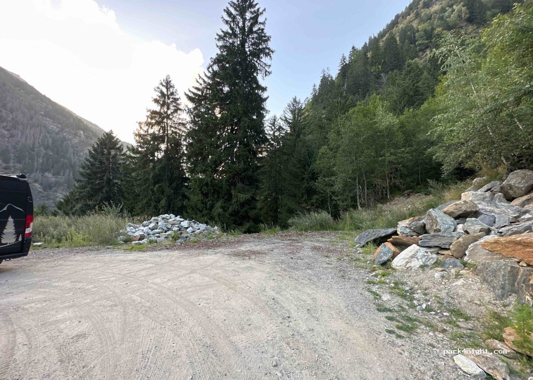 Gravel area next to a hairpin bend. Quiet at night with a beautiful view. Space for 2 mobile homes, the area is very straight and level.