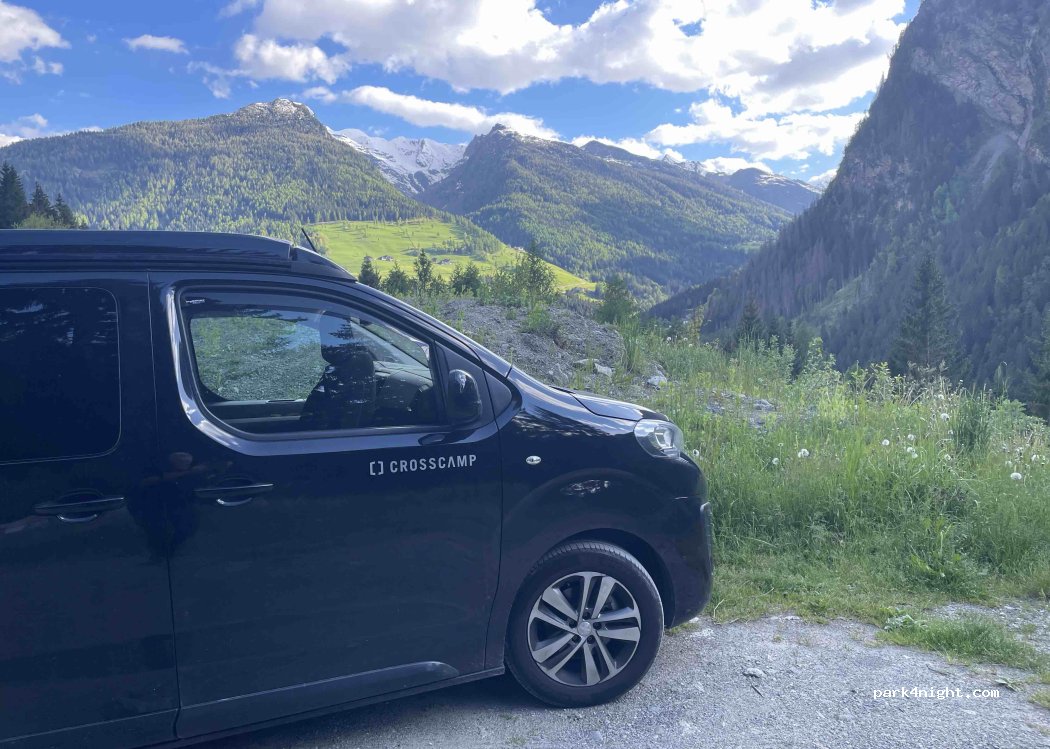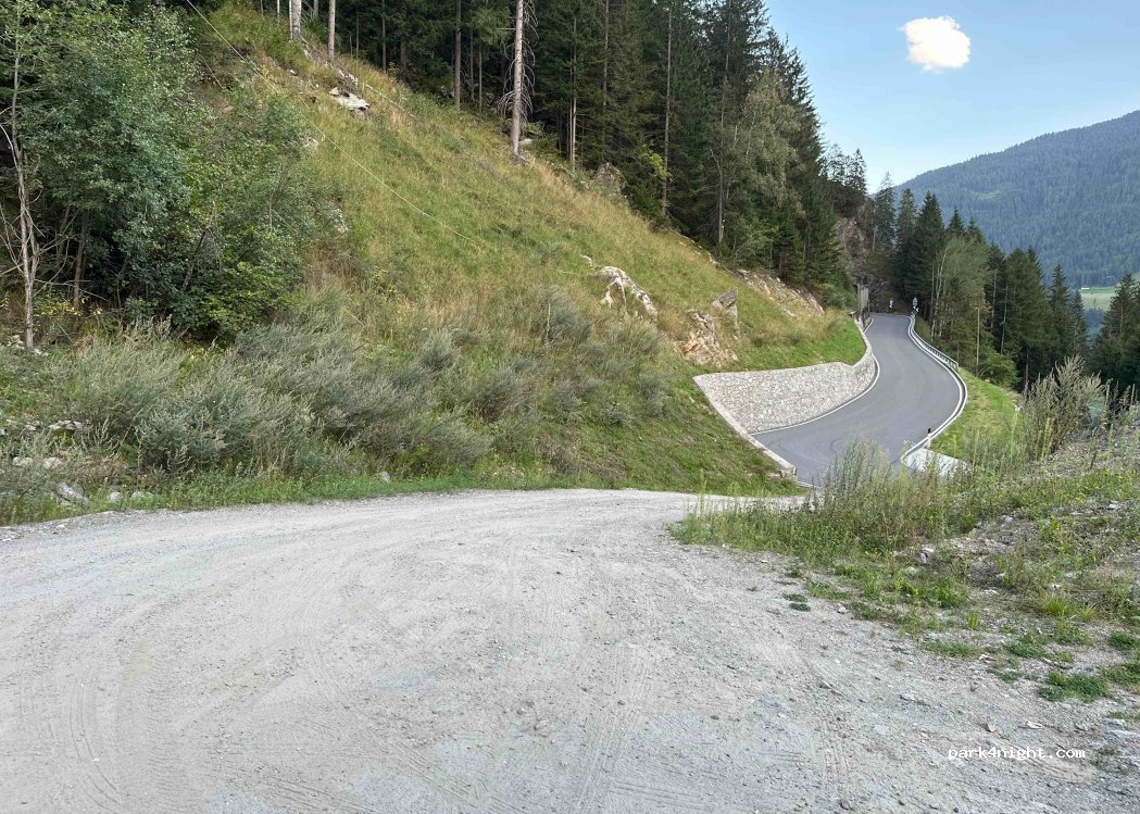 Petite plate-forme plate derrière un talus dans un virage en épingle. Au bord de la route, mais comme celle ci est fermée entre 20h et 7h, c'est très tranquille. Belle vue sur les montagnes. La route qui mène à l'Autriche grimpe vraiment à 2500 m avec des vues incroyables mais des virages à faire en 1ere parfois. Il ne faut pas avoir de vertige! 20 euros de péage pour passer la frontière.