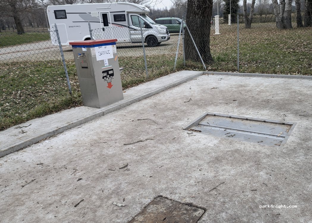 lo scarico in griglia è inutilizzabile per via della terra e erba, anche lo scarico della cassetta nella colonna è intasato, non funziona l'acqua potabile, forse le prese di corrente funzionano ma non le ho provate. area sosta utilizzabile solo per parcheggio, un peccato dopo mezz'ora di strada a vuoto