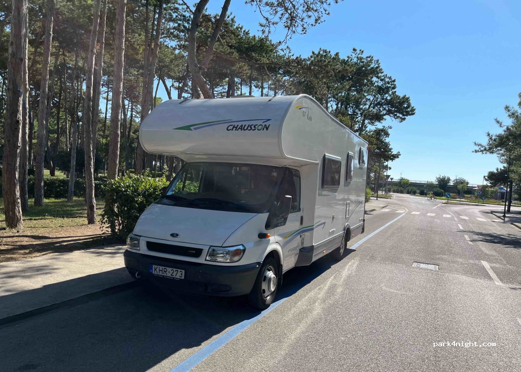 Paid parking. Supermarket, pizzeria nearby. The entrance to the beach is 50 m away, where you can take a cold shower for free and a hot shower for a fee. There are plenty of free parking spaces near the car park, but they were all taken when we arrived early in the morning. During the evening hours it was impossible to stay outside due to the many mosquitoes. The pedestrian street is about 3 km away.