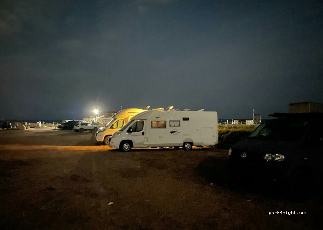 Parking at the beach restaurant "Star Beach". Substrate (in summer) made of dry lawn. The way here is a gravel road full of potholes, but is used by cars and mobile homes. We stood here with two other motorhomes. Everything is quiet, only the country road in the distance with occasional traffic.