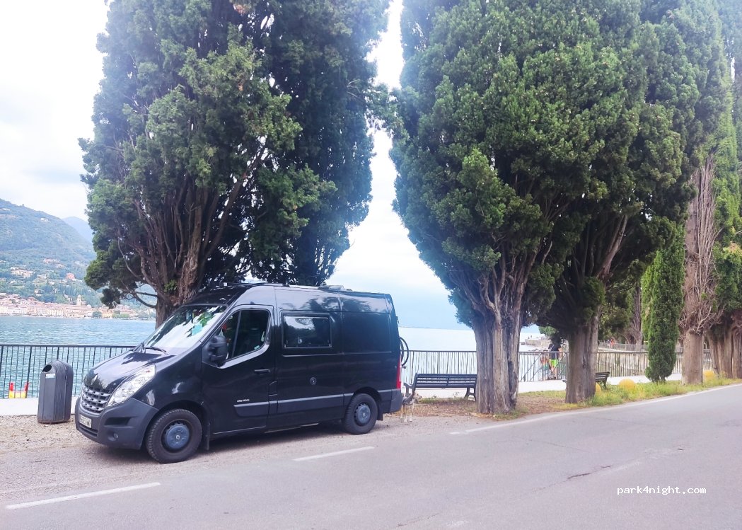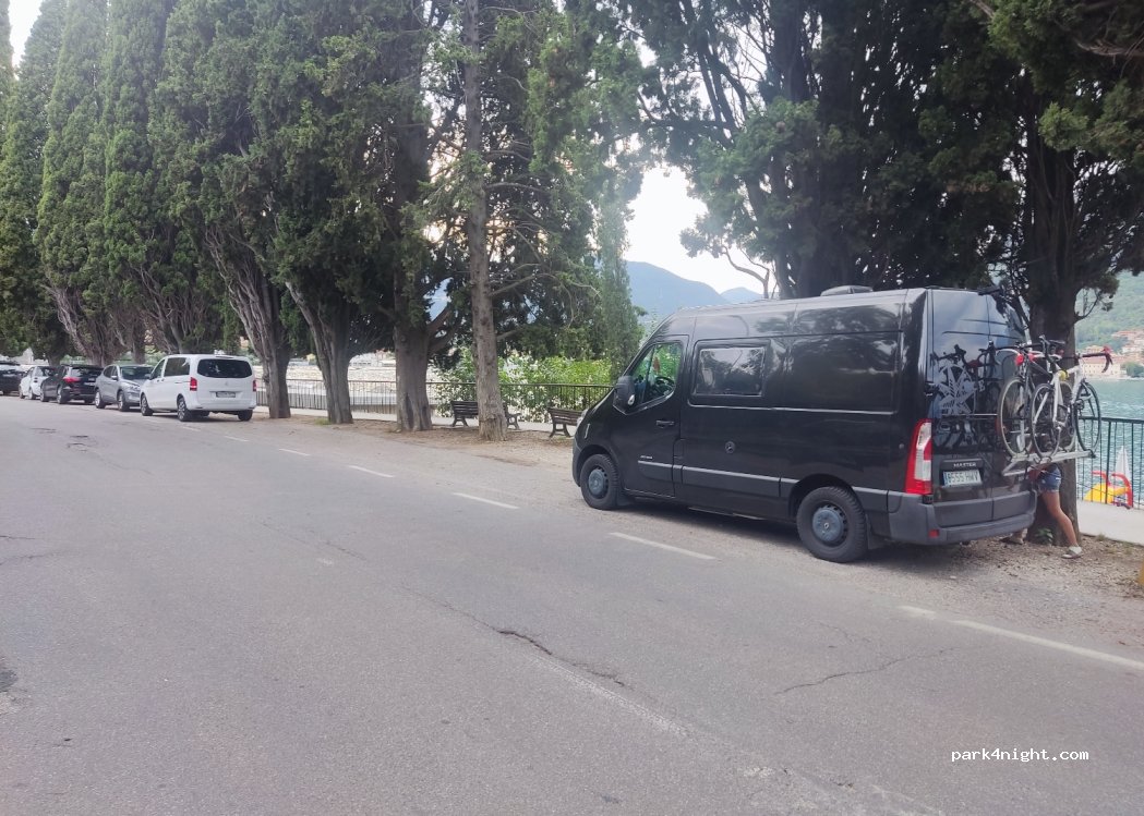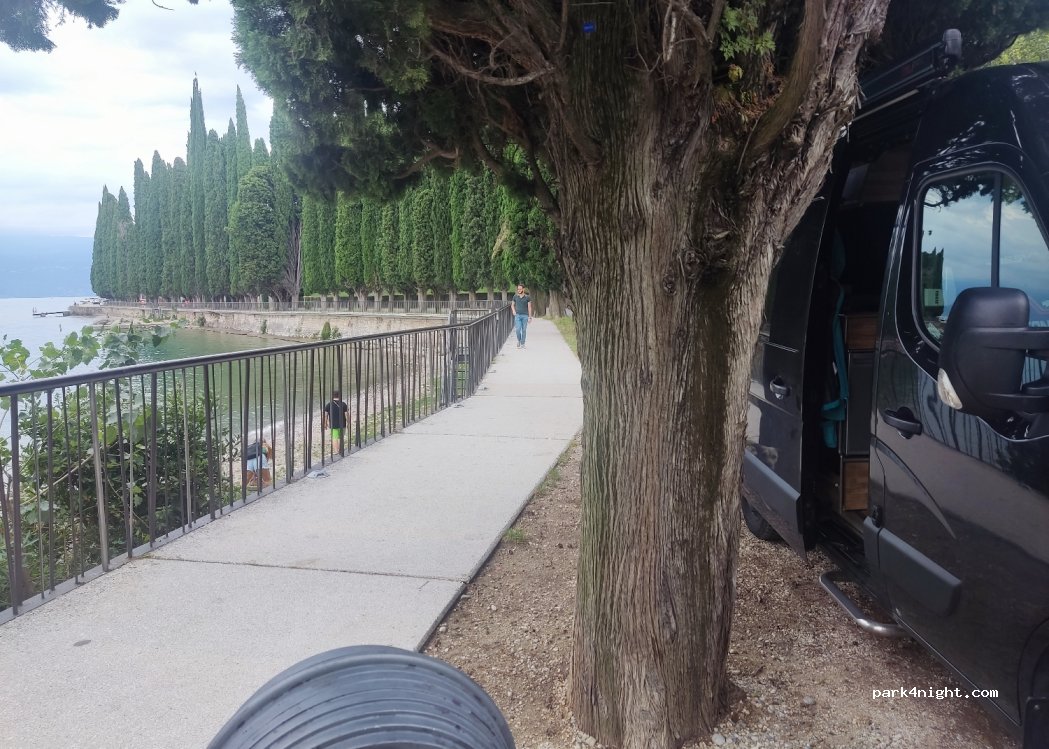 Parking à côté de la route et du lac. 3 places sans limite de hauteur ni de longueur. Un peu bruyant à cause de la circulation en journée. Il y a une plage acceptant les chiens juste à côté et un bar/restaurant.