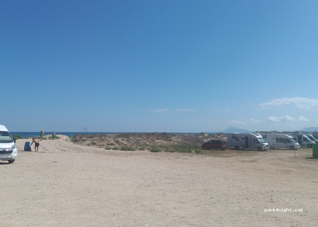 Un descampado al lado de la playa, en una urbanización de extrarradio. Hay un puente, que la carretera bajo el es sin salida lo que aporta intimidad. Lejos de tiendas, bares y demás. Fui a primeros de septiembre, tranquilo junto a otras caravanas.
