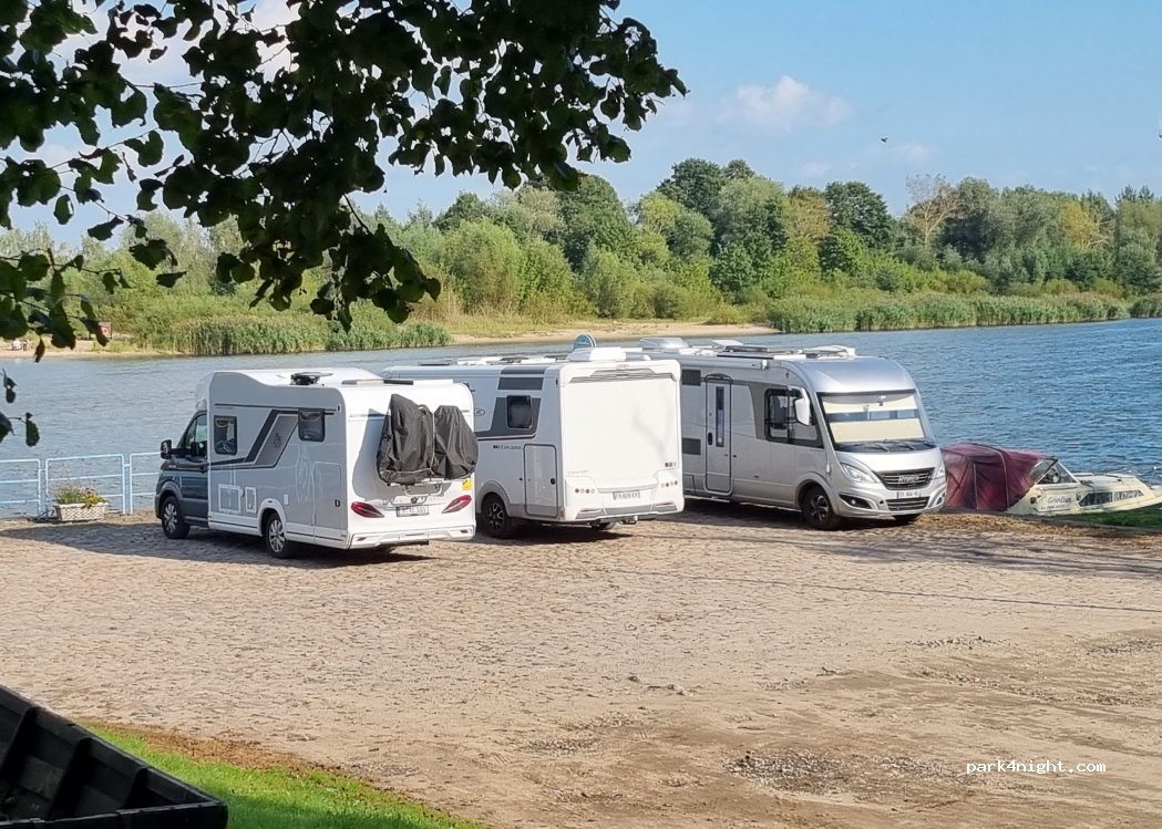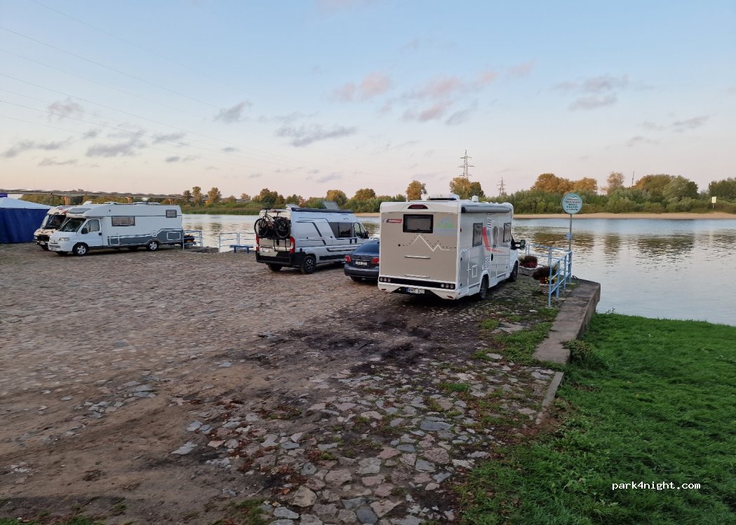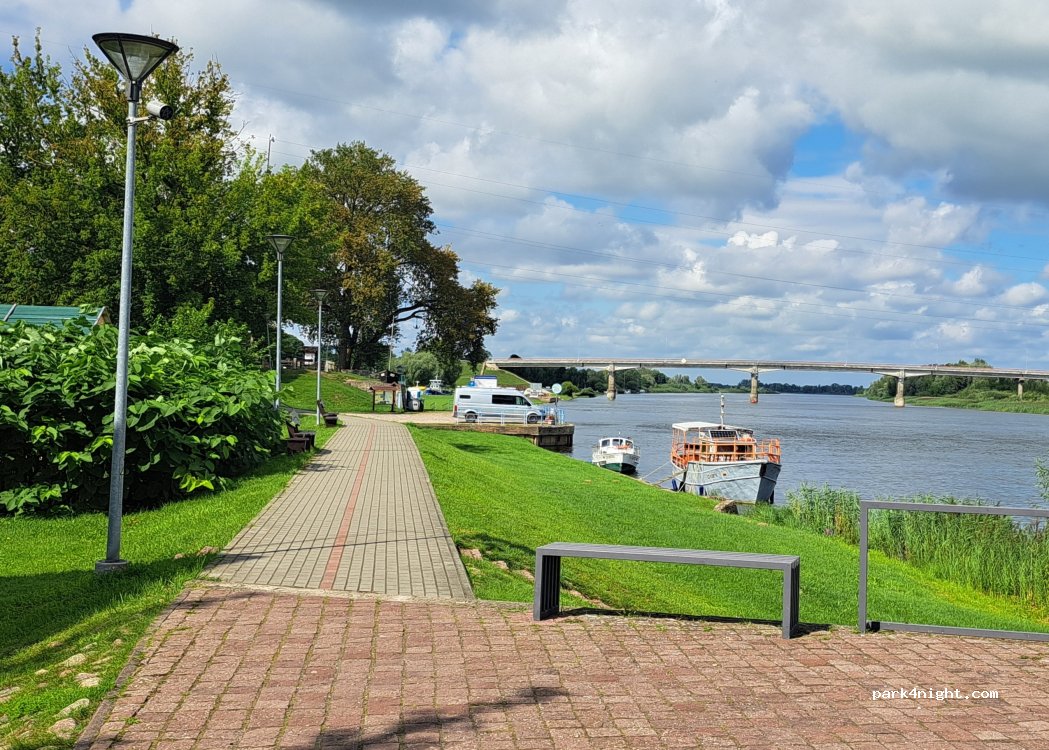 Petit parking calme au bord de l’Atmata, face à l’oblast russe de Kaliningrad : ambiance singulière à deux pas de la frontière. Sol stabilisé, plat, accessible à tous gabarits mais sans ombre. Aucun service hormis des toilettes ToiToi. Restaurant à 50 m. Bonne réception 5G. Endroit simple mais agréable pour une halte.