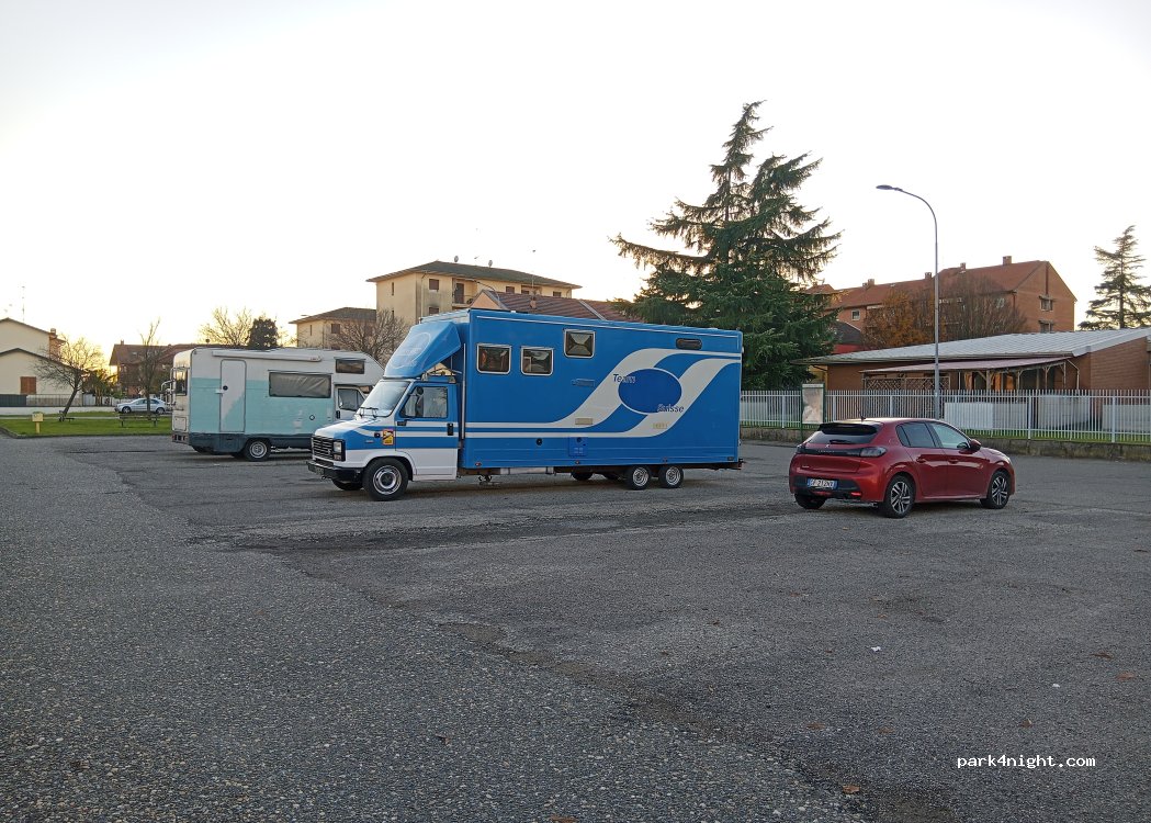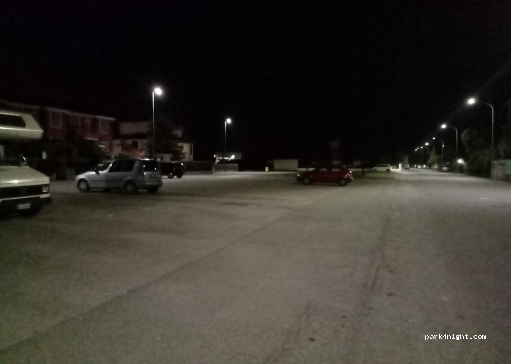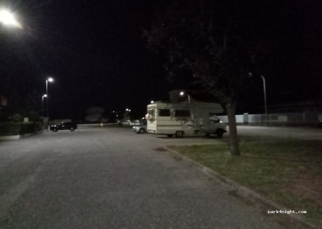 È un parcheggio per una sosta notturna e diurna, non ha limiti di tempo. non si può campeggiare. nelle vicinanze c'è un bar 24h, e nella giornata c'è un supermercato ed anche un bazar cinese. ad appena 2km c'è anche un carico e scarico per camper gratuito. (vicino all'uscita/entrata dell'autostrada).