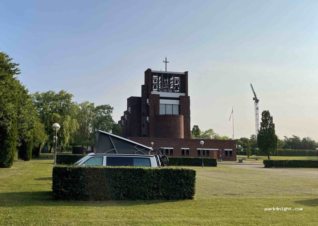 Parkplatz direkt neben der Kirche. An sich ein echt ruhiger Parkplatz aber ab 8:00 leuten die Kirchenglocken wider.