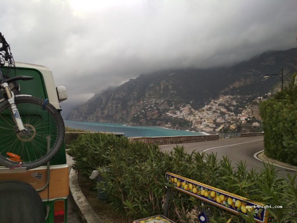 Small parking place next to the road with an beautiful view to Positano and the coast. Only one place to an cliff. You have to park close to the bushes so other cars can pass when they stay for taking some photos.