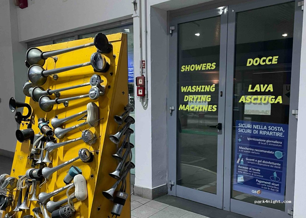 Parcheggio vicino alla stazione di servizio Q8. La stazione di servizio dispone di servizi igienici, doccia e lavanderia