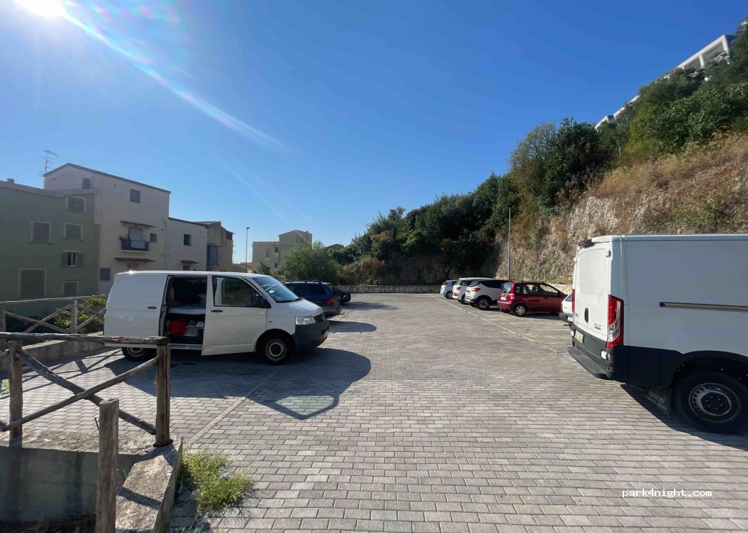Parcheggio su due livelli, più posti nella parte alta del parcheggio. È un parcheggio dove parcheggiano le persone della strada e delle zone circostanti. Una notte qui di domenica sera senza disturbi, è sicuro, calmo. Ci sono un sacco di gatti in giro.