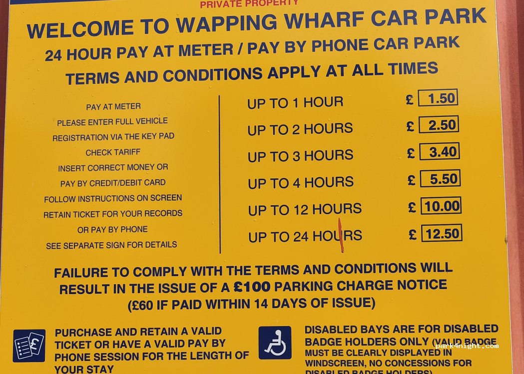 Wapping Quay car park. No facilities. £4.50 for 24hrs at the weekend. £ 9.00 during the week on Spike Island in the centre of Bristol 's docklands. Ideal for exploring Bristol over a weekend.