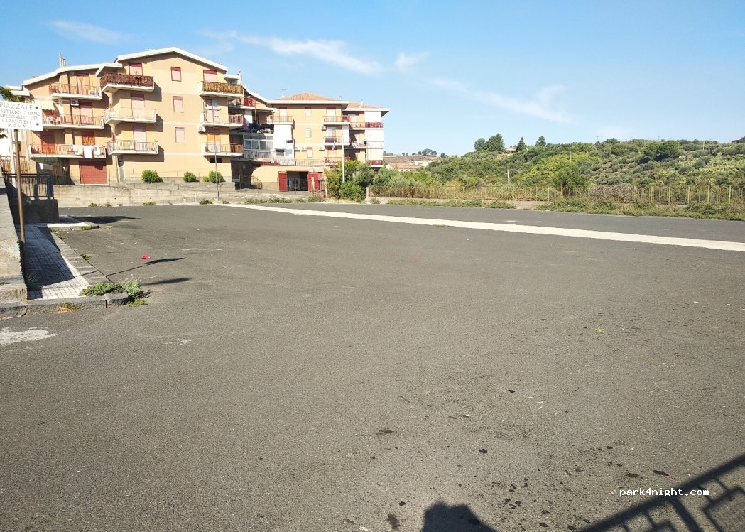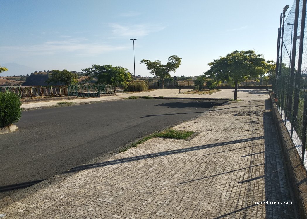 Ampio parcheggio degli impianti sportivi sono due uno più piccolo arrivando e l'altro molto più grande nel senso opposto di marcia il primo è ben illuminato il secondo un po' meno, a 100 m. supermercato coop, dista 800 m. dal centro storico vicino alla villa comunale, cestini per la spazzatura a 50 metri, pulito non c'è la solita sporcizia, la strada in fondo è chiusa quindi tranquillo per dormire la notte, bella vista su un canion.