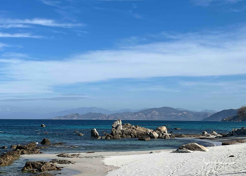 Une nuit paisible avec le bruit des vagues. Un lever de soleil derrière les collines, une eau turquoise et une plage de sable blanc. Balade sur la plage et dans les rochers hors saison on se sent seul au monde c’est génial !
