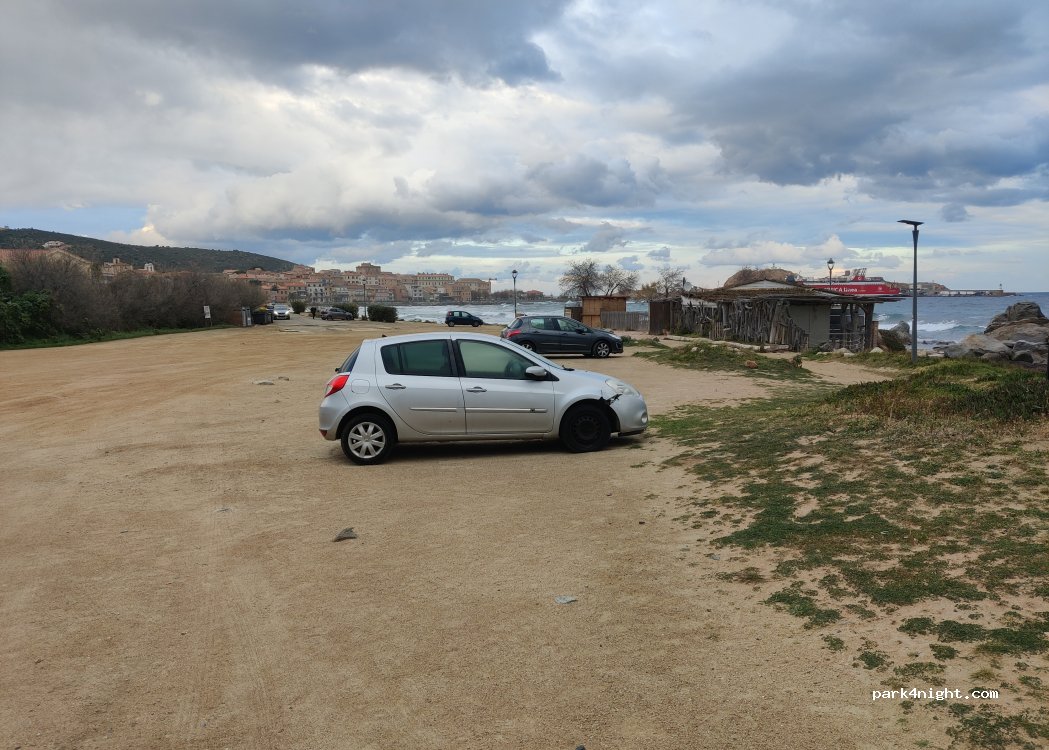 Très grand parking, avons passer une nuit en sortant du férie, je ne pense pas qu’il y est mieux en arrivant Tard. Les pieds dans l’eau à 5 m de la plage, un peu de bruit de jeunes mais rien de méchant. Très pratique pour visite l’île Rousse.
