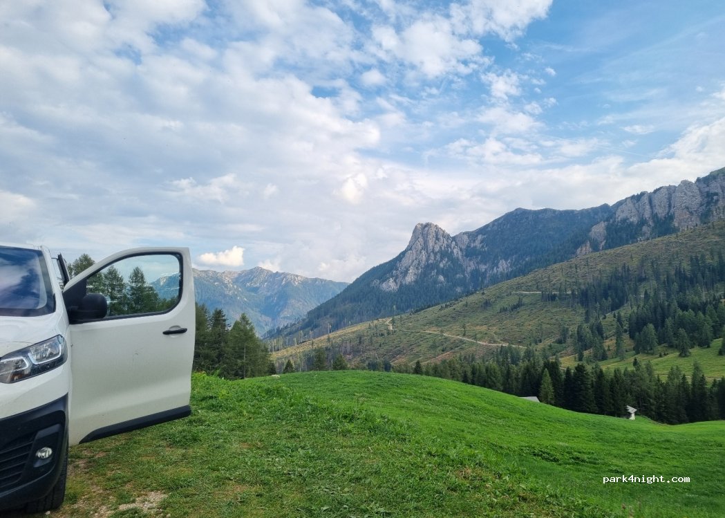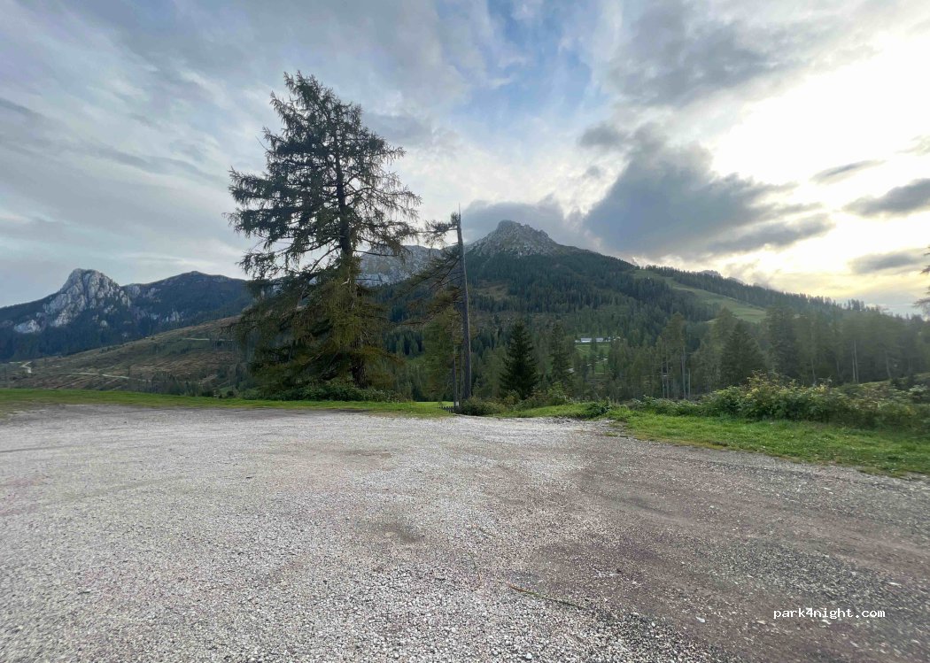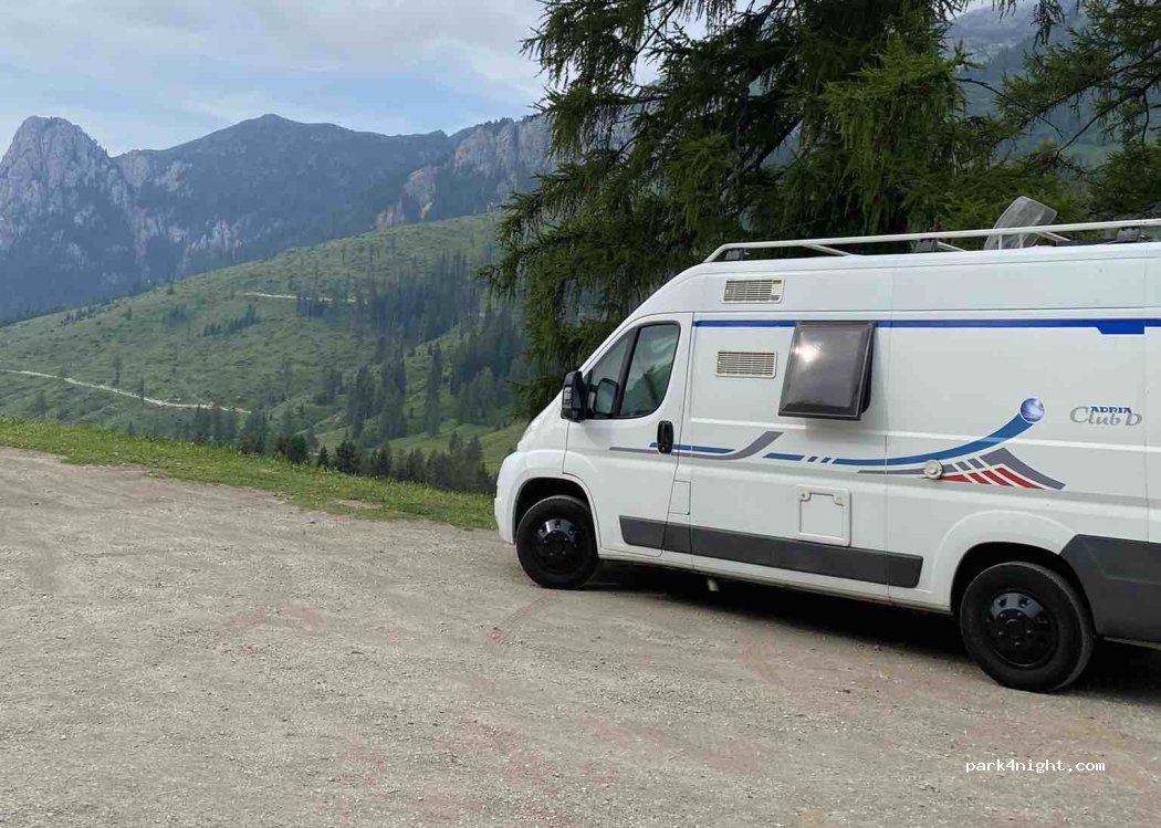 Parcheggio lato strada. Di notte tranquillo. di giorno molto trafficato. Vicino lago di Carezza e a Vigo di Fassa. Vicino tavoli con giardino. Perfetto per tour itinerante.