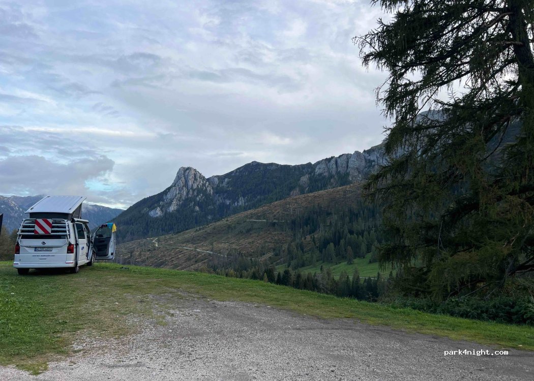 Right on the road but was an absolutely beautiful view to wake up to. We stayed a bit further down (closer to pozza di fassa) and had a very peaceful night. You get used to the cars driving past, but try to be incognito as I don’t think they like vans there (we had no issues for one night).
