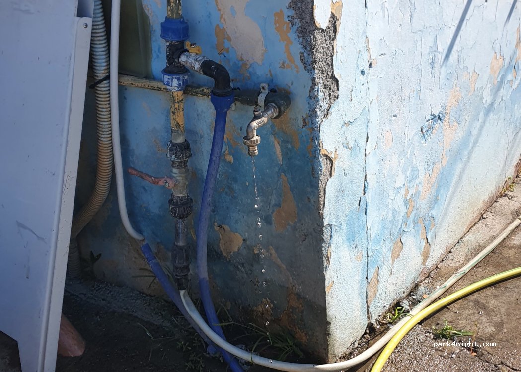 Es gibt die Möglichkeit, Grau- und Schwarzwasser zu entleeren. es hat auch Duschen und Wc die leider geschlossen sind. das Wasser konnten wir am Wasserhahn auffüllen. Wenn man den Siebaufsatz entfernt kann man mit dem passenden Gewinde den Schlauch befestigen.