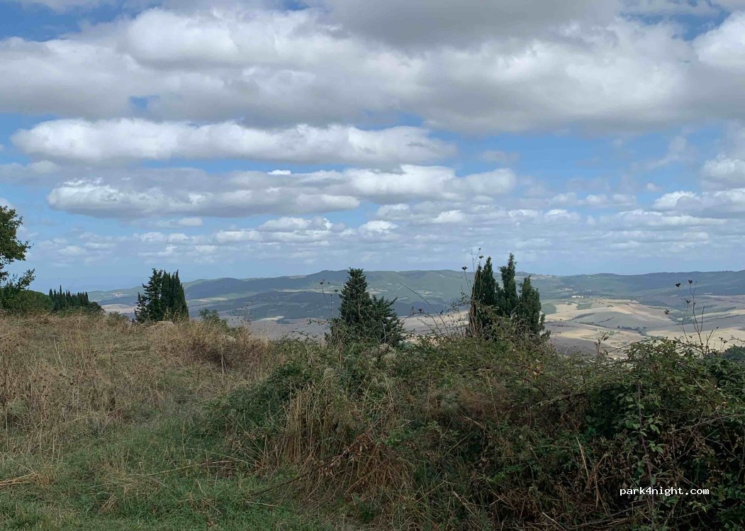 Parking gratuit, calme, laverie et supermarché à 3min à pieds. Volterra à 15min à pieds. Une vue magnifique du fond du parking :)