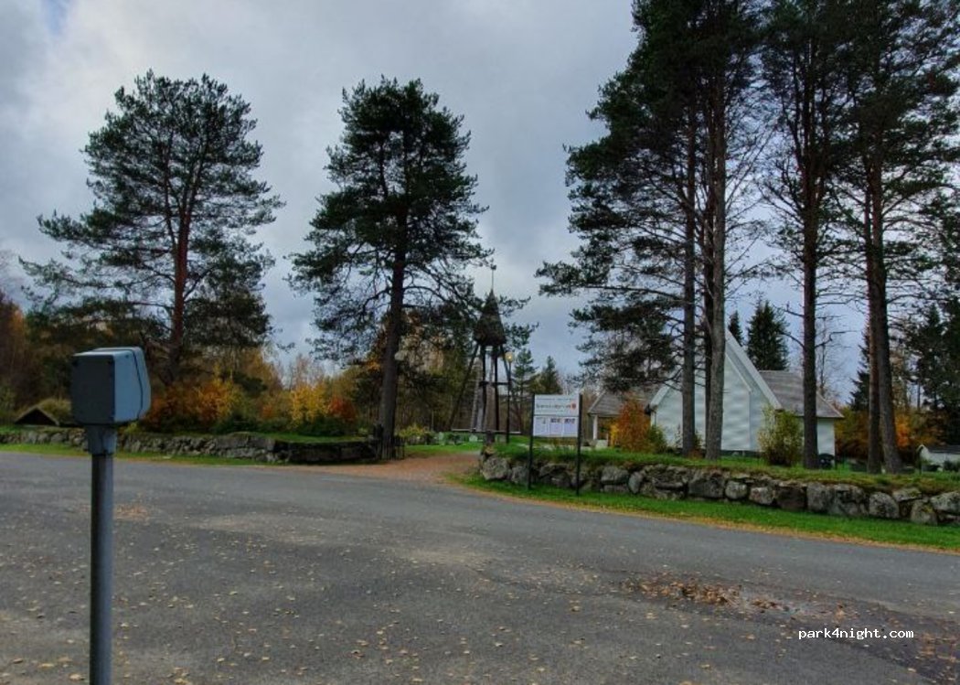 Aparcamiento en Lappträsk Kyrka, a 50 m de la carretera nº 398 (carretera secundaria, poco tráfico). Asfalto. Contenedores de residuos y columnas eléctricas disponibles.