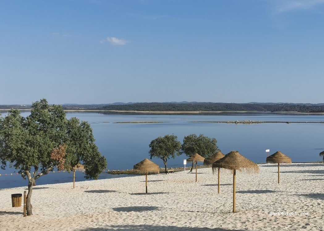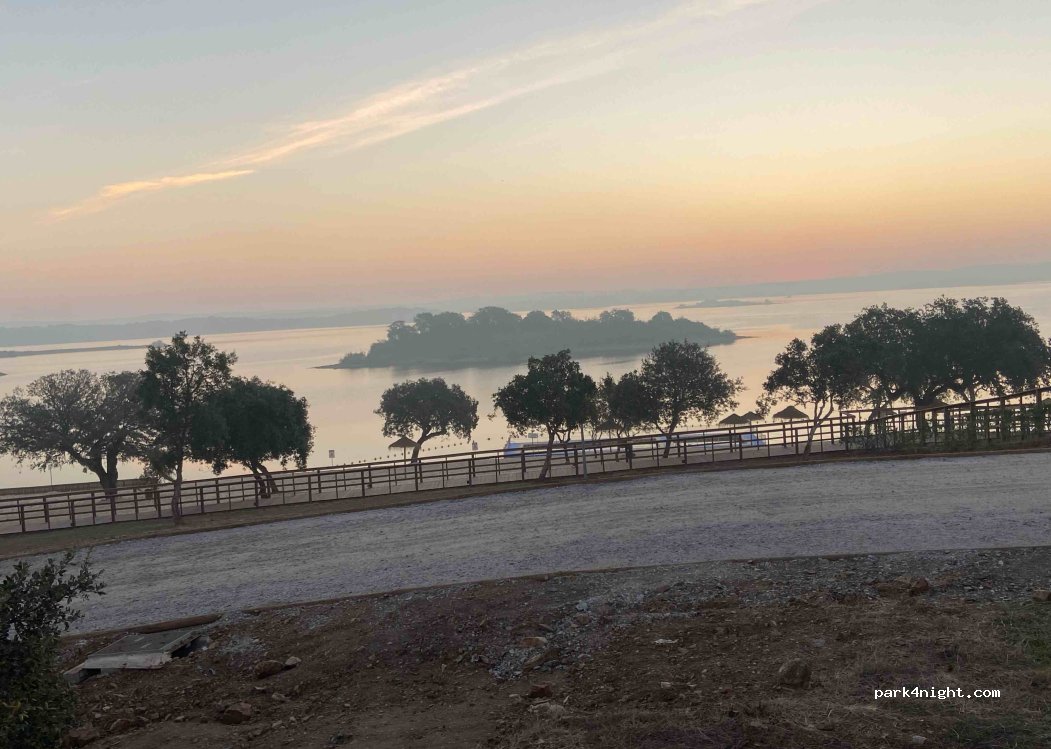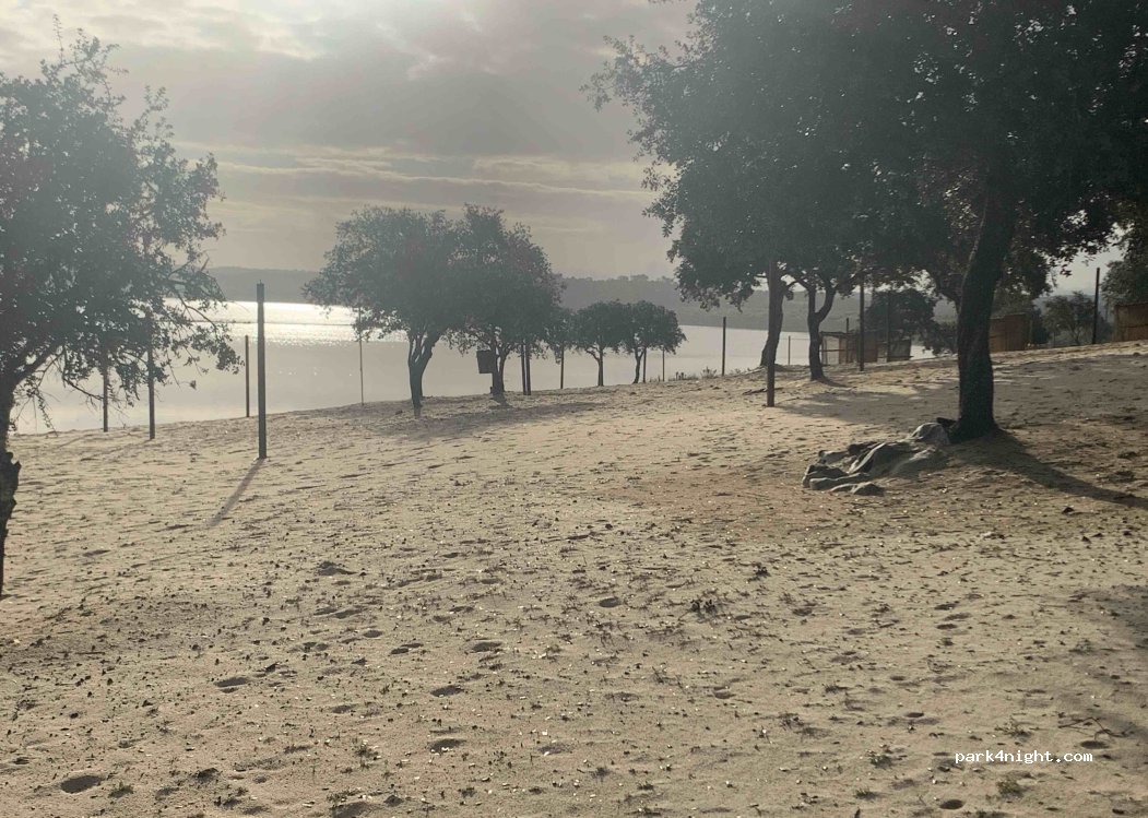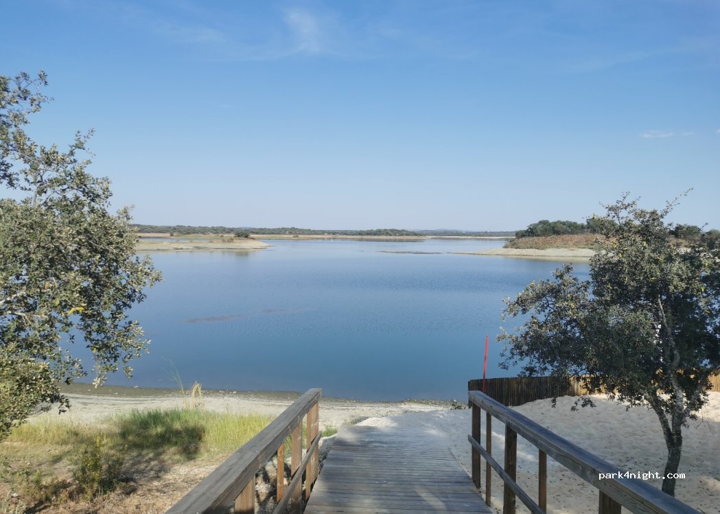 We had an amazing 2 night stay. Very quiet at night. The man made beach was great with the Bar/Cafe open from midday to 11.00 ish (don’t know went to bed at 10) there were toilets on the beach. No services apart from bins. We cycled to Viana do alentejo 10k away along track/small road for a coffee and a supermarket. Loved it here and would have stayed longer if there were services.