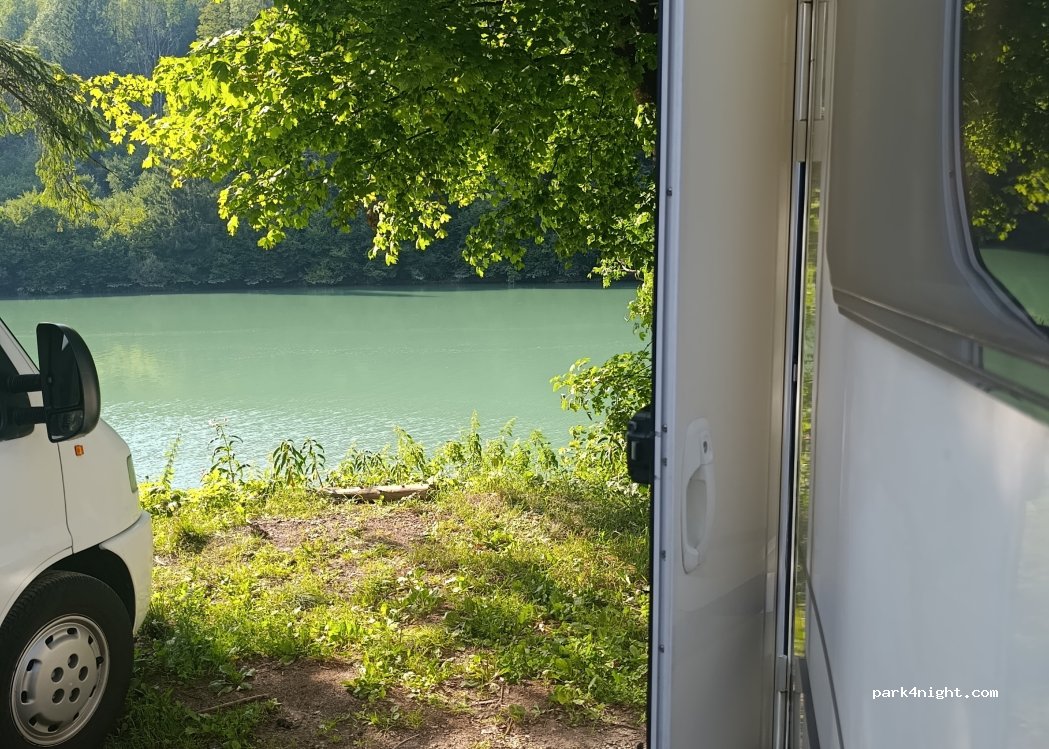 Notte tranquilla in mezzo al bosco e a bordo lago. gratuito spazi generosi specialmente a fine giornata quando gli escursionisti vanno via. cestini nel parchetto adiacente tenete pulito rispettate la natura se volete che noi camperisti siamo sempre bene accetti