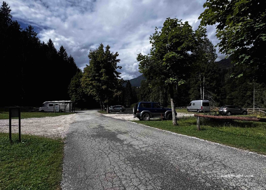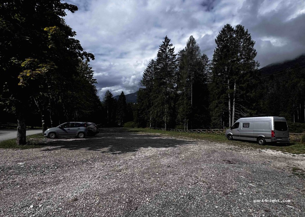 abbiamo passato una notte molto tranquilla in questo parcheggio fronte lago. il giorno dopo siamo partiti direttamente a piedi verso il rifugio padova, 8 km andata e 8 km ritorno. Disponibilità di fontana e qualche gioco per bimbo. Unico punto di attenzione è che il parcheggio si trova a fianco della strada.