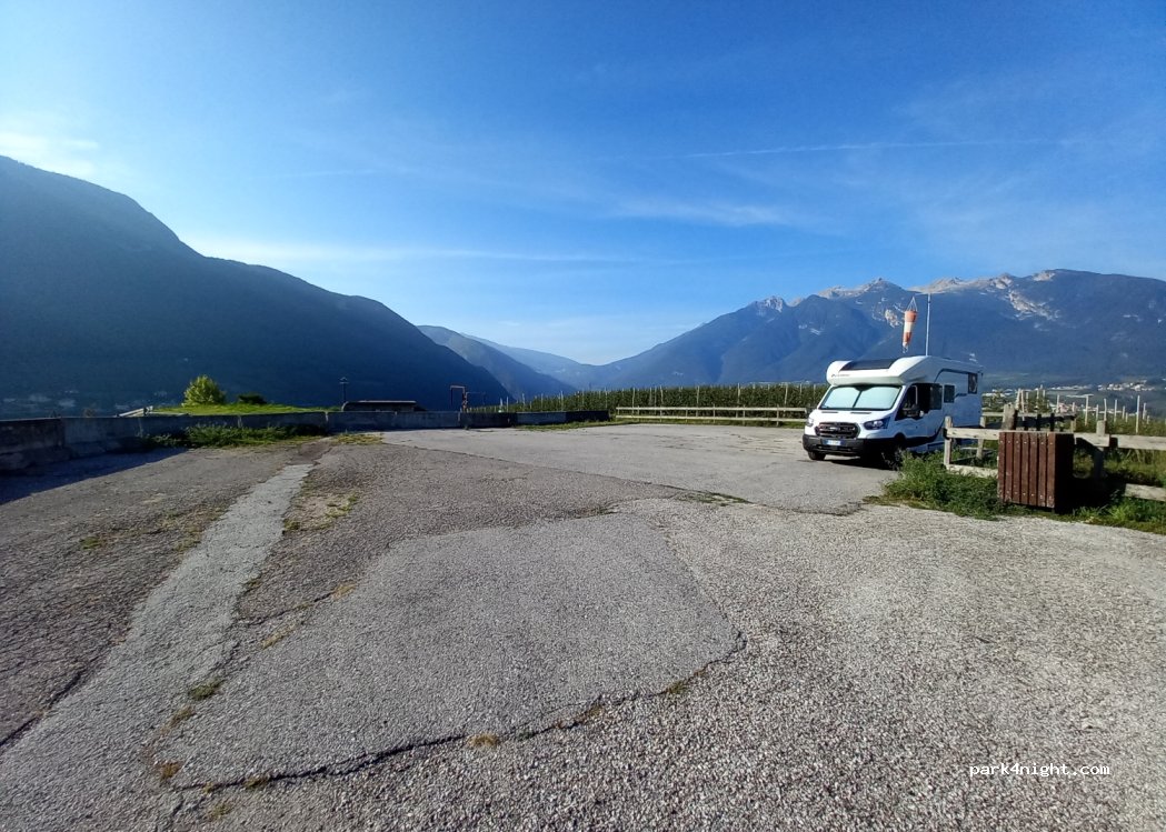 Non illuminato. senza servizi solo parcheggio,ottimo per passare la notte in mezzo alle piantagioni di mele.