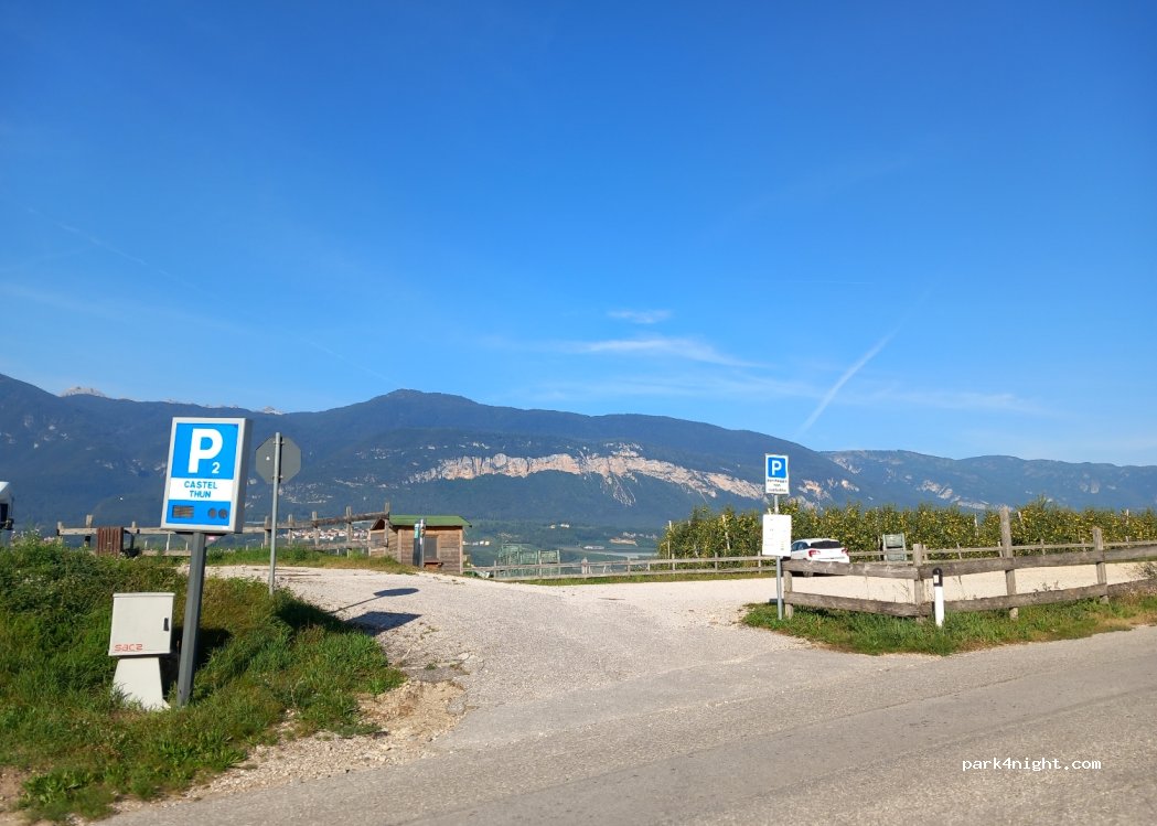 Parcheggio senza servizi gratuito e dopo visita a Castel Thun abbiamo dormito benissimo circondati dai meleti