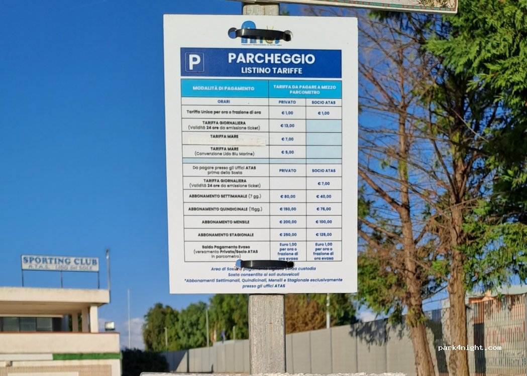 Parcheggio a pagamento, gratuito fuori stagione diurno e notturno, molto spazioso.