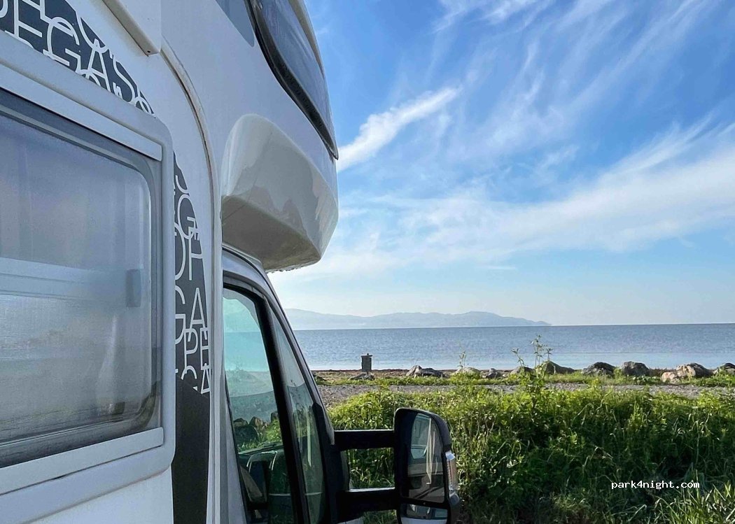 Parcheggio sul mare, é possibile tendalino e tavolino e accendere fuochi, non ha acqua ma solo scarico a cassetta in maniera molto artigianale al costo di 3 euro. No ombra ma vista stupenda