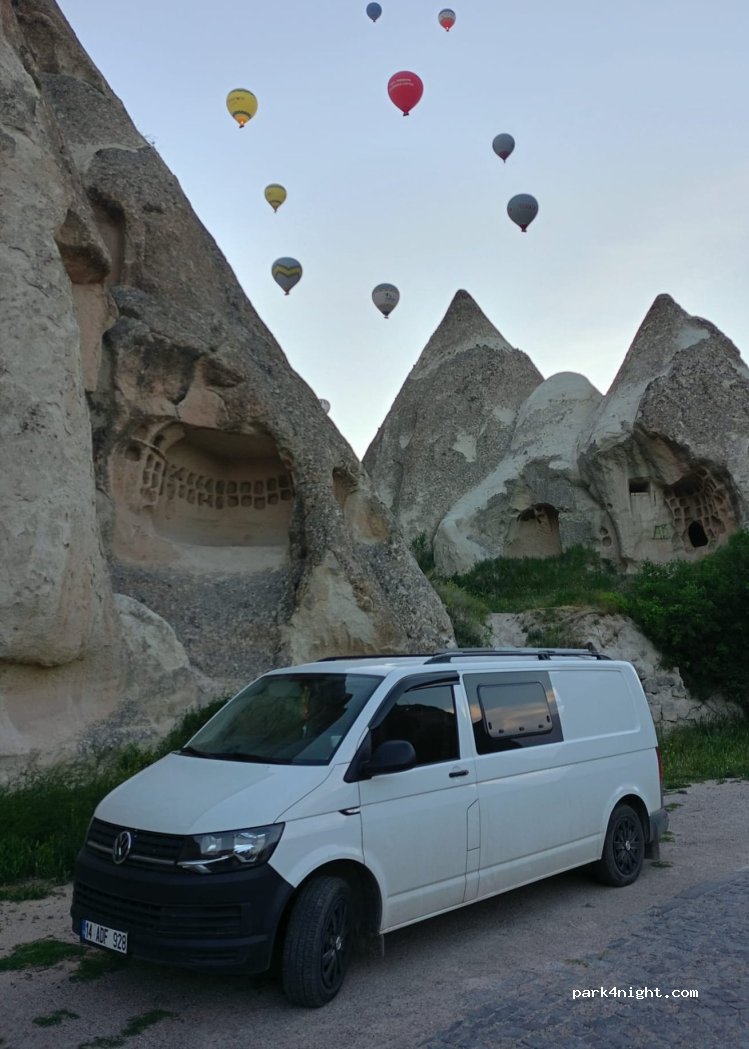 Pequeña explanada donde entran unas 3-4 campers. Bastante nivelado. Hay cubos de basura cerca. El pueblo de Göreme está a 4 minutos andando. Lo malo es que hay dos lugares cerca donde montan fiestas. Nosotros dormimos bien una noche, pero la segunda nos tuvimos que ir a otro sitio a dormir por la música que había.
