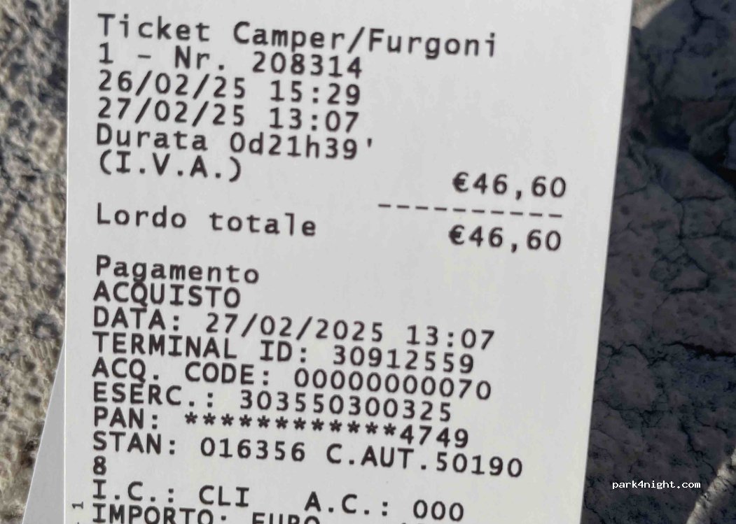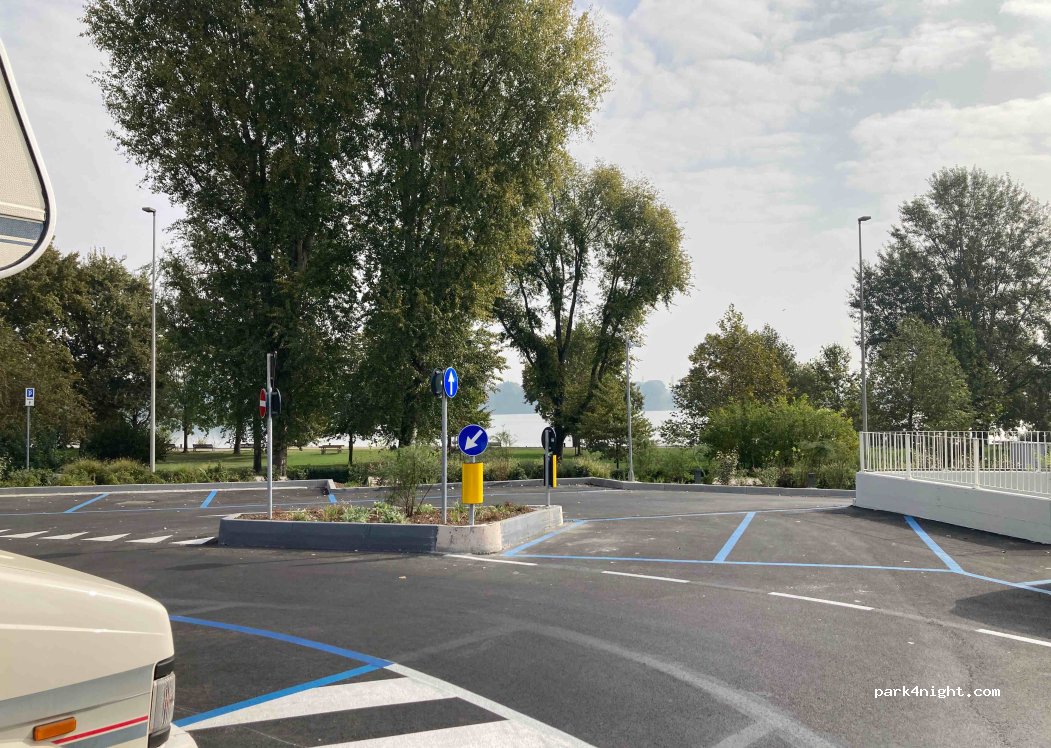 Newly created parking for smaller vehicles. I was able to park well with a 5.40 m camper. If you want to risk using two parking spaces, 7m is definitely fine. Excellent location for visiting the city.