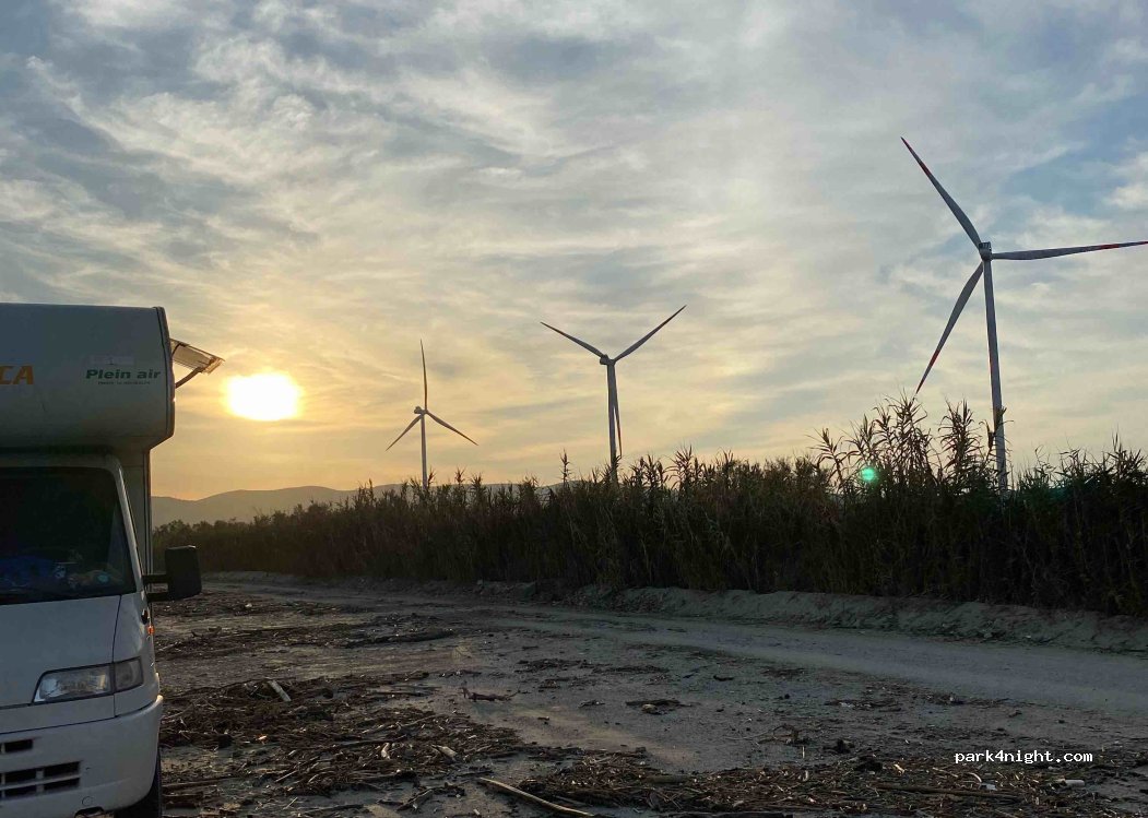 Spot sul bordo della spiaggia, a pochi metri dall'acqua. L'accesso è attualmente aperto (metà ottobre), ma le recinzioni all'inizio della strada suggeriscono che il posto è accessibile solo in bassa stagione. Presenza di pala eolica e di un porto a poche centinaia di metri (quindi leggero rumore). Grande popolazione di zanzare al tramonto.