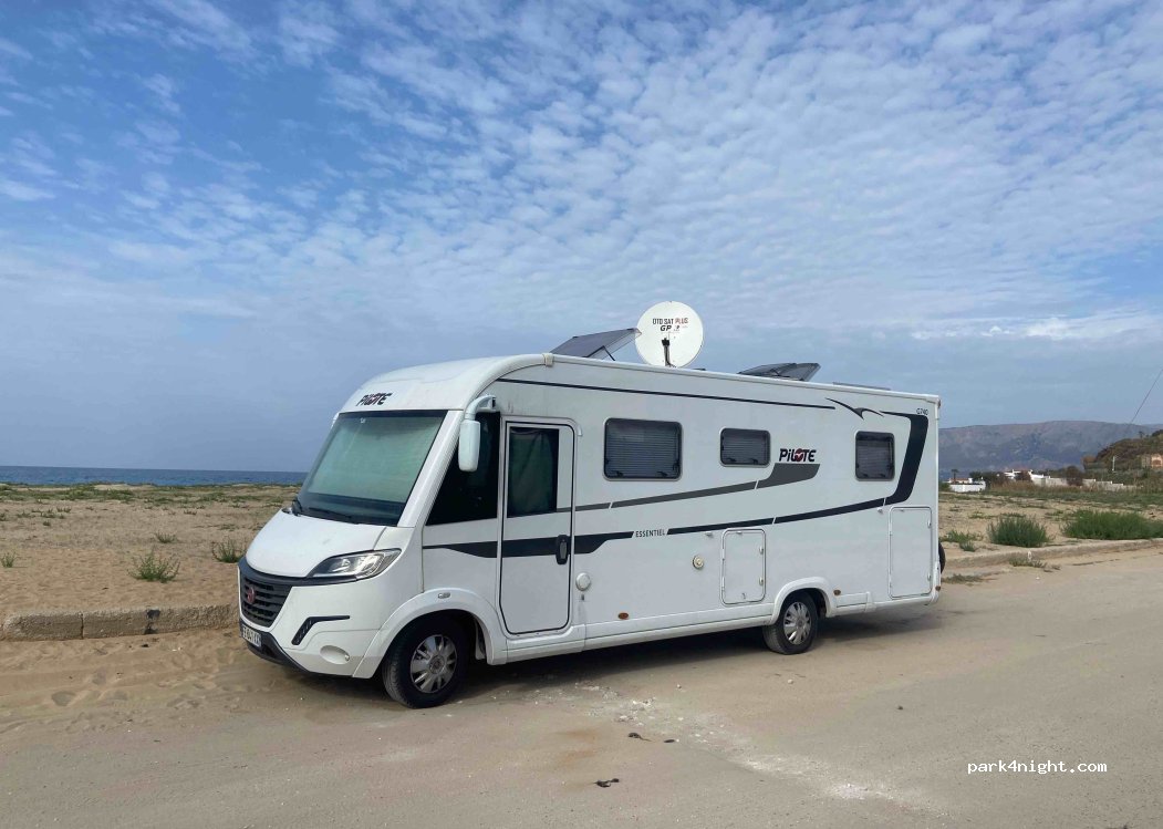 Out of season there is absolutely no one on this small road by the beach. 2 restaurants closed in October. The municipal police told us that we could stay the night. No noise, just the sea. In high season this should not be the case