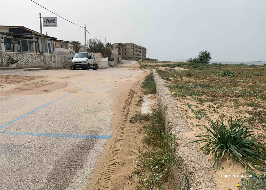 Parcheggio lungo una strada, poco frequentata vicino al mare, con strisce blu, ma a pagamento solo in alta stagione. Durante la nostra permanenza ha aperto la pizzeria-ristorante, alla sera si riempie di macchine ma non danno disturbo. Abbiamo sostato per due giorni e due notti senza problemi.