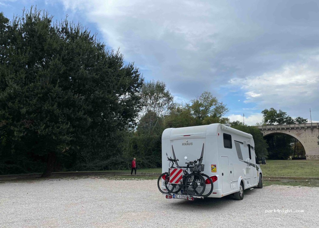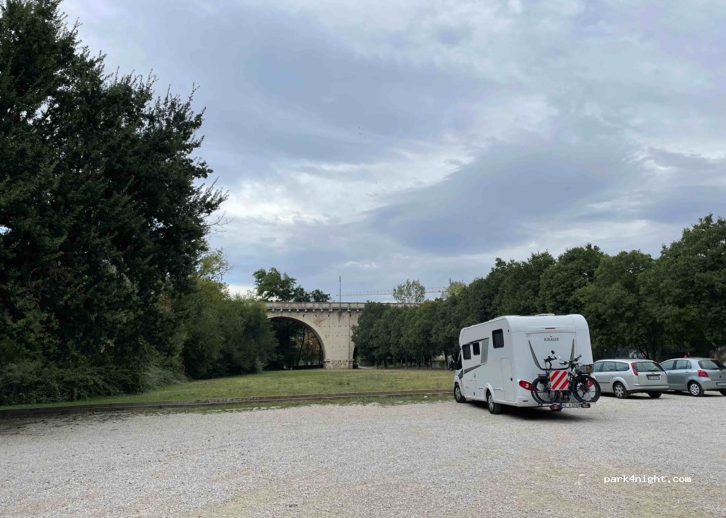 Parcheggio gratuito senza restrizioni nel parco. L'accesso è un po' stretto, ma possibile anche per cellulari da 8 metri. Molto tranquillo per un posto in città, molto adatto ai cani, poiché ci sono opportunità per passeggiate più lunghe nel parco. Supermercato, centro storico e impianti sportivi a pochi minuti a piedi. Niente V+E. Non illuminato.