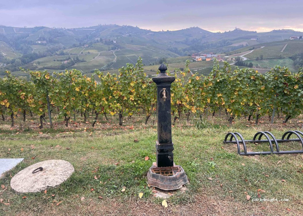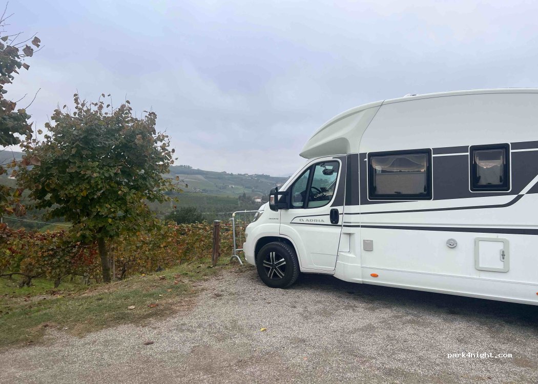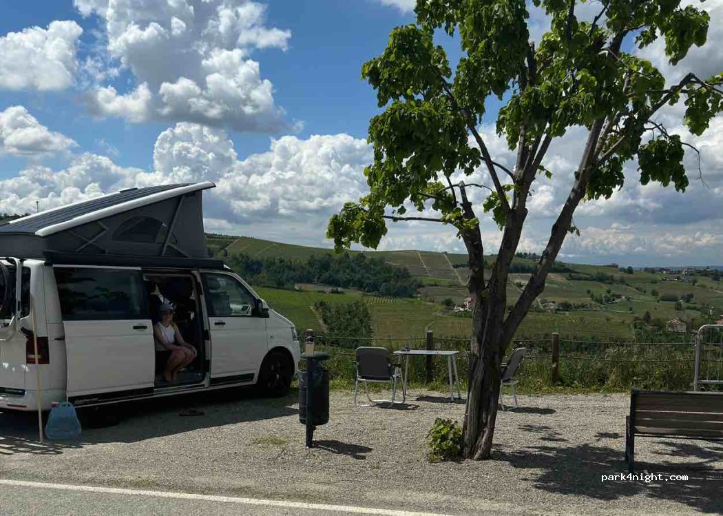 Top Stellplatz mit wunderschöner Aussicht über das ganze Piemont und liegt Mitten in den Weinbergen. Zwar an einer Strasse gelegen aber es fahren nur selten Autos vorbei. Super ruhige und angenehme Nacht. Es hat einen Brunnen mit frischem Wasser. Sehr empfehlenswert!