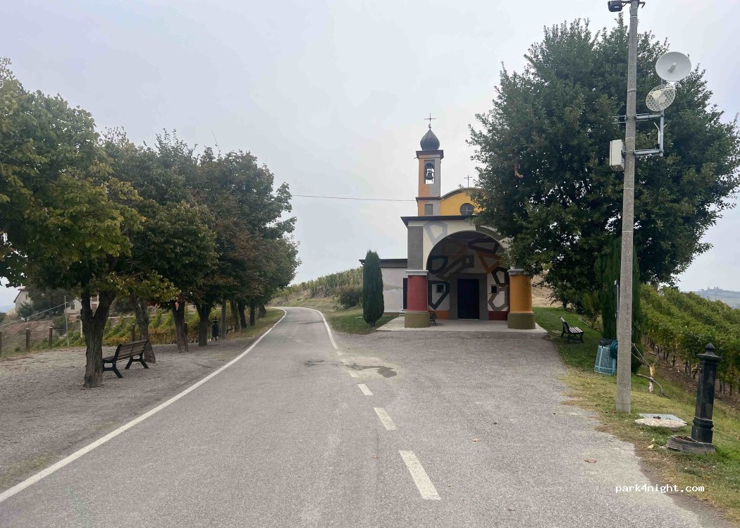 Spiazza senza alcun divieto per camper e auto. Ci stanno due van o un camper fino a 7m per il lungo. Vista mozzafiato! Affianco a chiesa artistica e alla vigna dei pastelli!!