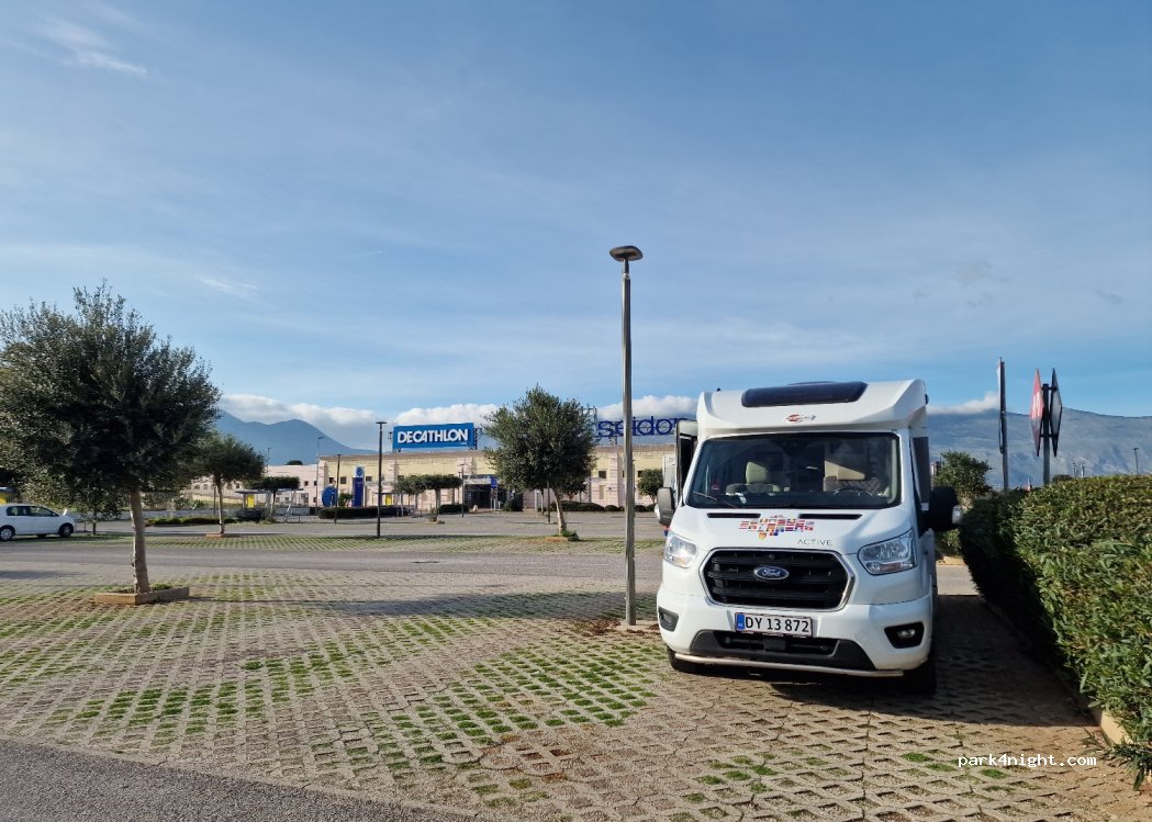 Parcheggio gratuito del centro commerciale, ho sostato 3 notti in compagnia di altri camper. La notte del sabato, alcuni motociclisti, facevano il rally dopo la chiusura: rumoroso ma non ci hanno disturbato. Ho potuto utilizzare i servizi interni del centro commerciale, e fare la spesa. Esperienza positiva.
