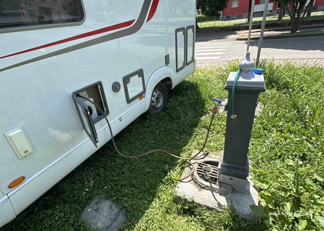 Wasserhahn am Conad Supermarkt. Es gibt auch große Mülltonnen und Spielplatz.