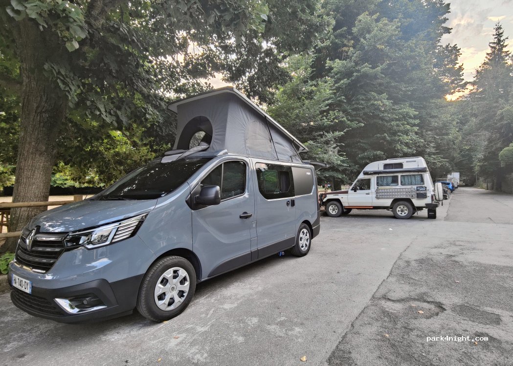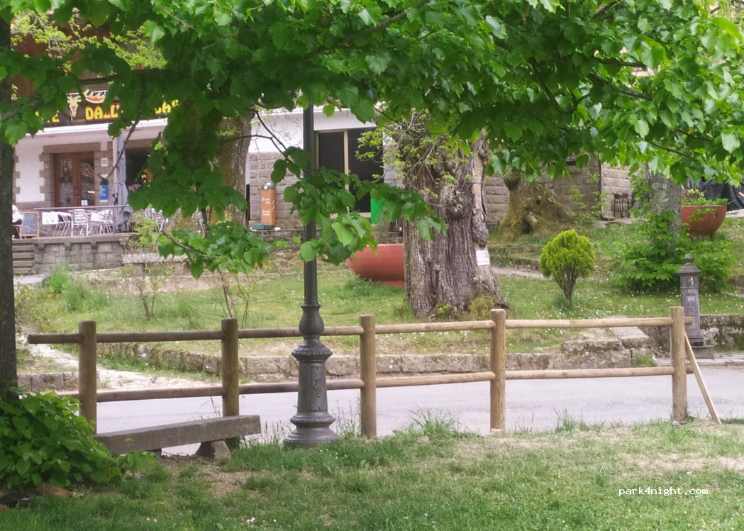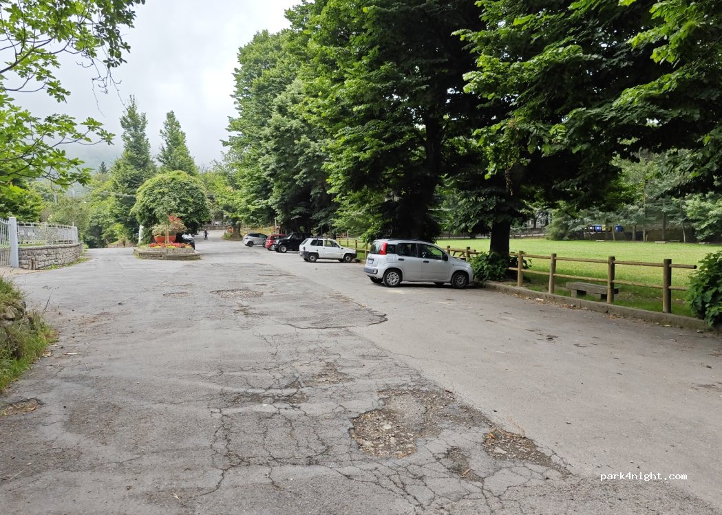 Ampio parcheggio senza cartelli di divieto. Ristorante/bar, panetteria e parco giochi proprio accanto al parcheggio. Ombra sotto gli alberi. Fonte d'acqua accanto al ristorante.