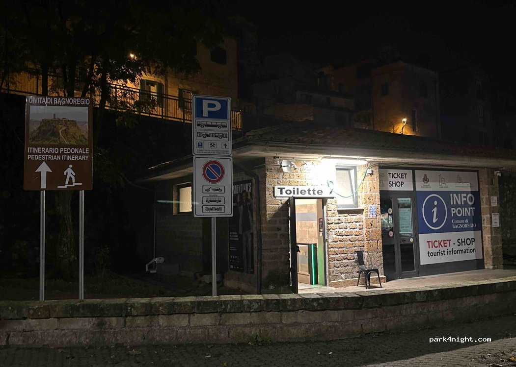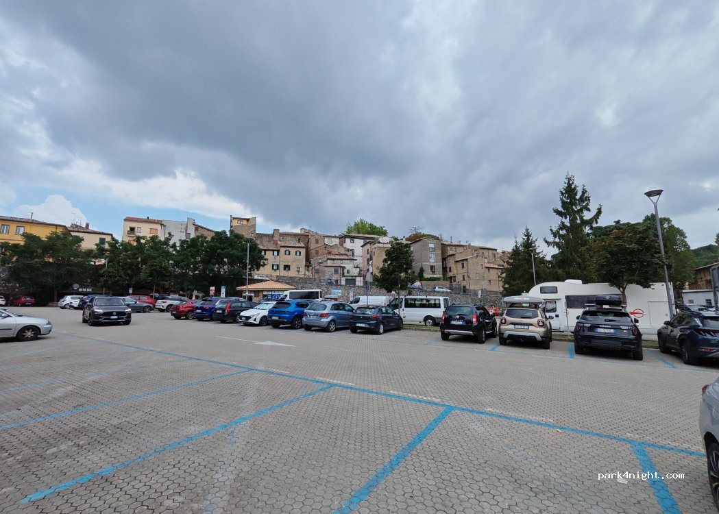 Parcheggio ottimo per visitare Civita, circa mezz'ora a piedi anche qualcosa meno. €2h, accetta i camper. A pagamento fino alle 20. Da li parte la navetta per Civita, ultima alle ore 18.45. Parcheggio in pendenza, sconsigliato per la notte.