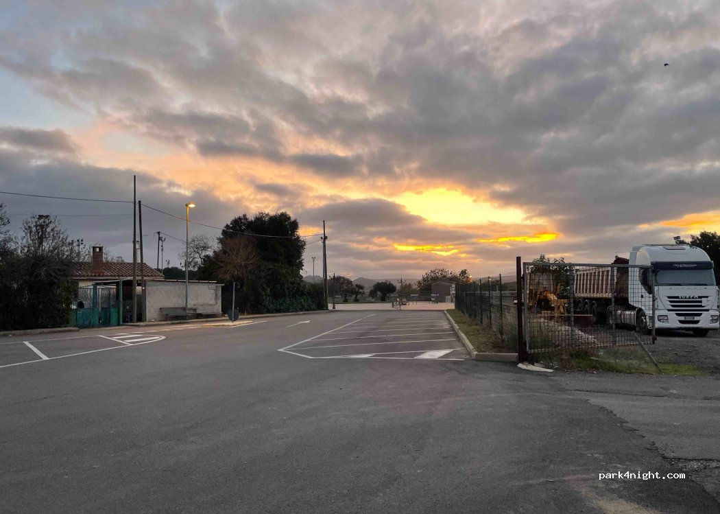 We came to saboris antigus and the event organizer told us to park here. Perfect place to visit the city. Very quiet even during the day. The neighbours are kind. We had a wonderful pizza nearby. Flat place. No services at all, just a parking without any shadows.
