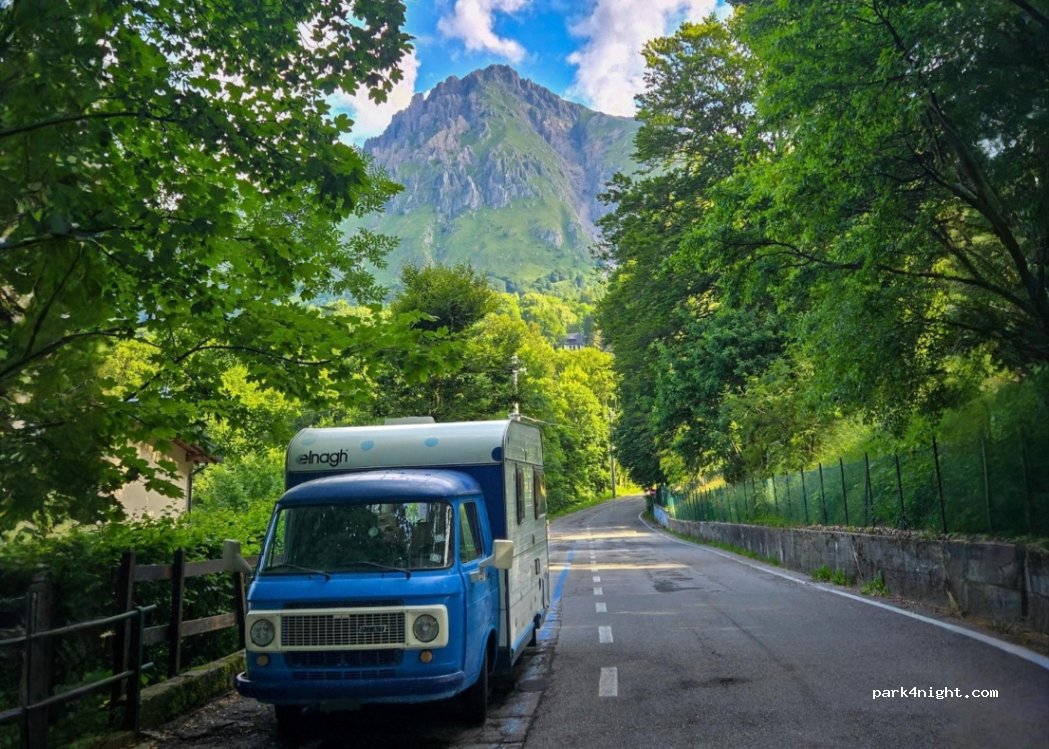 Paid roadside parking from 8am to 8pm. On the right there is a small square but the seats are on a slope, on the left they are on a very slight lateral slope. There are restaurants and shelters to eat at and two small campsites nearby.