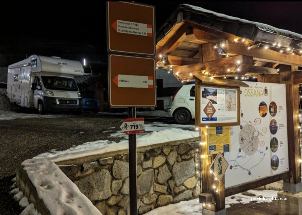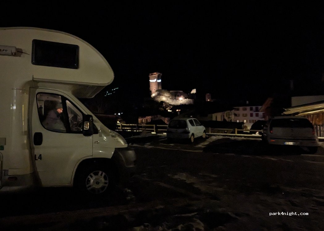 Parcheggio gratuito tranquillo la notte, tranne per la sveglia alle 7 delle campane della chiesa di fronte... bellissimo il percorso dei 1000 ed oltre presepi nel paese e visita alla sera entro le 18 al castello a pochi minuti a piedi (abbiamo visto lo spettacolo di luci dentro il castello alle ora 17.30) ma penso sia visibile solo durante il periodo natalizio