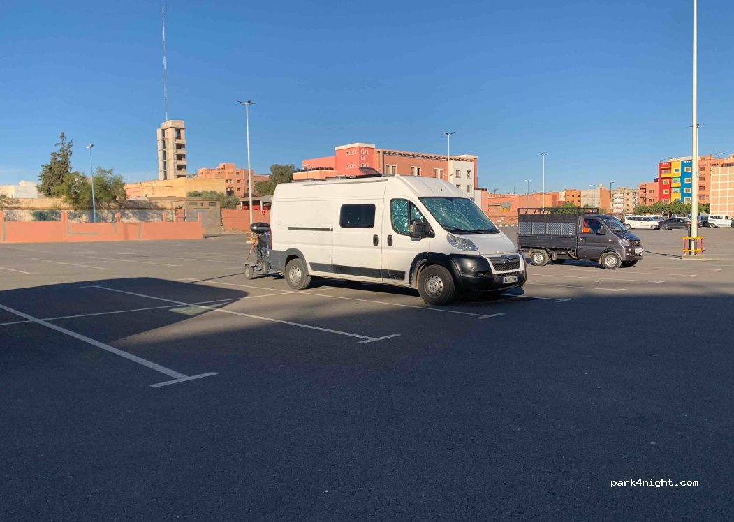 Parking Marjane, plus à l’écart du centre ville que l’autre, nous avons demandé l’autorisation pour une nuit en dépannage et ils ont accepté. A part un chien qui nous a réveillé au moins 2 fois, au vu du lieu, c’était correct. Merci au Marjane car il n’y a rien dans le coin.